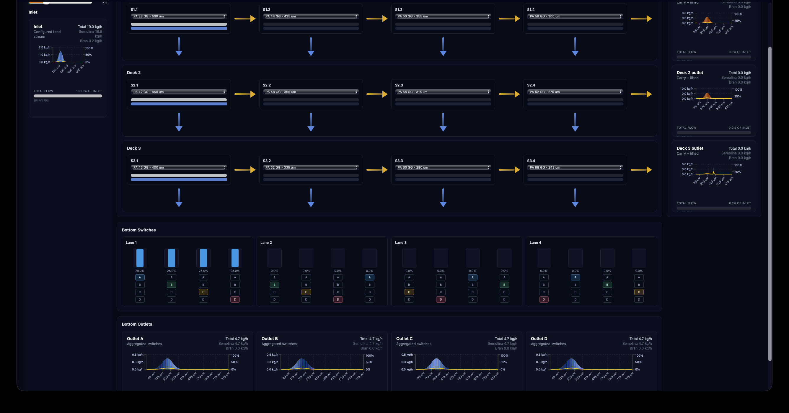 아래 (https://new.redtea.kr/ai/515)에 이어서⋯ 공정내 중요 설비의 시뮬레이터를 만들어보았습니다. 제분 공정에서 중요한 설비인데 표준화된 데이터도 거의 없고 설치된 공장이나 공정내 위치에 따라 규격설정과 운영이 굉장히 까다로운(경험적 데이터가 많이 필요한) 설비인데, 시뮬레이터를 만들면 효과적일 것이란 생각이 들어서 제작했습니다. 실제 설비를 그대로 옮겨놓기 위해 입도데이터와 유량을 묶어서 구조체로 만들어 한 번에 다루게 하고, 데이터를 다루는 요소들을 모두 객체로 선언해서 디자인했습니다. PRD를 만들 때는, 제가 알고 있는 모든 내용을 브레인 덤프하듯이 적어넣고 설비에 대한 자료도 같이 넣은 다음, 인공지능이 이해한 내용을 SVG 로 그려내라고 하고 오류가 있는 부분을 수정했습니다. 틀린 내용이 없다 싶을 때 PRD.md를 생성한다음 기술스택을 지정해서 코드를 뽑아냈습니다. 만들고 나서는 인터페이스 개선과 표준 수치 조정하는 정도의 작업만 했습니다. (물론 스크린샷의 데이터는 더미 데이터) 3
