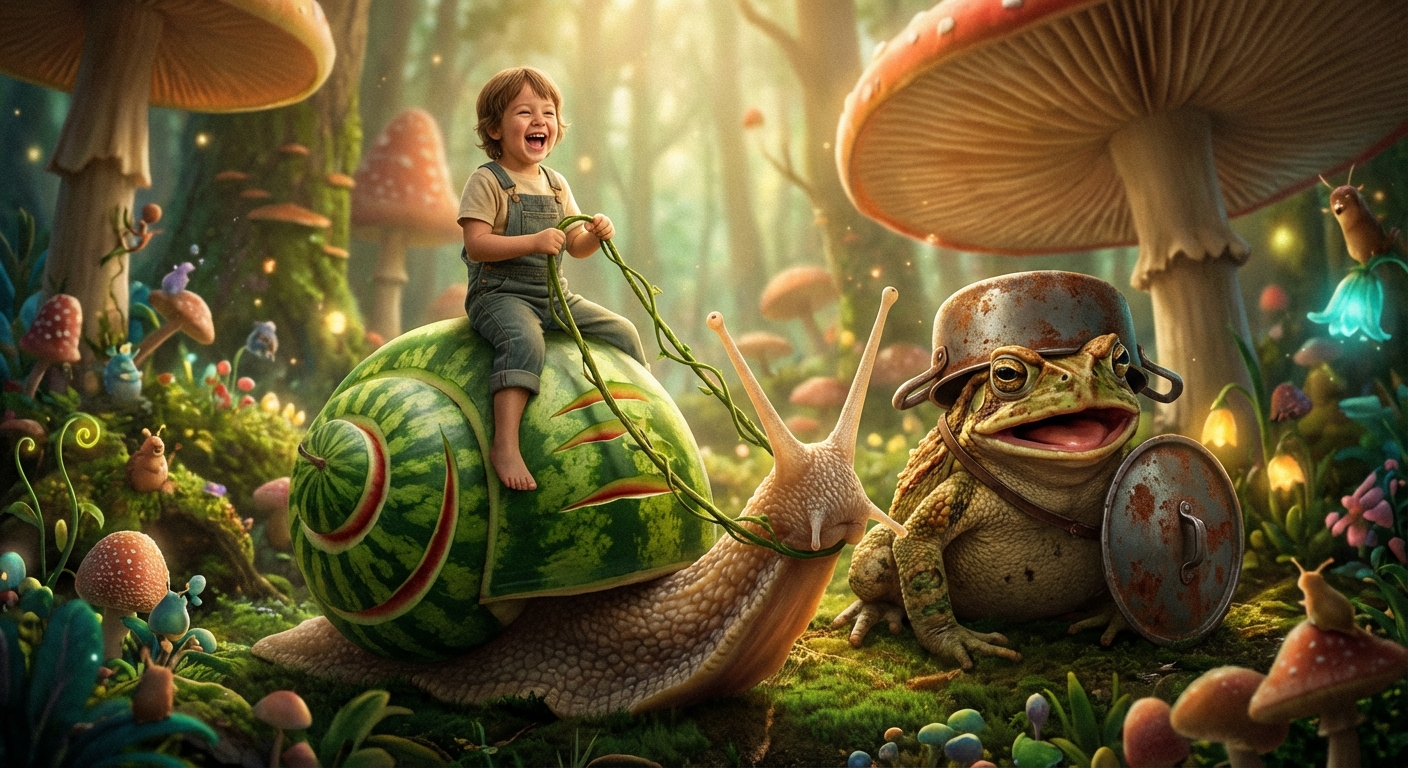 @나노바나나 수박으로 달팽이를 타면서 뚜껑으로 두꺼비를 하는 그림을 그려줘. 0