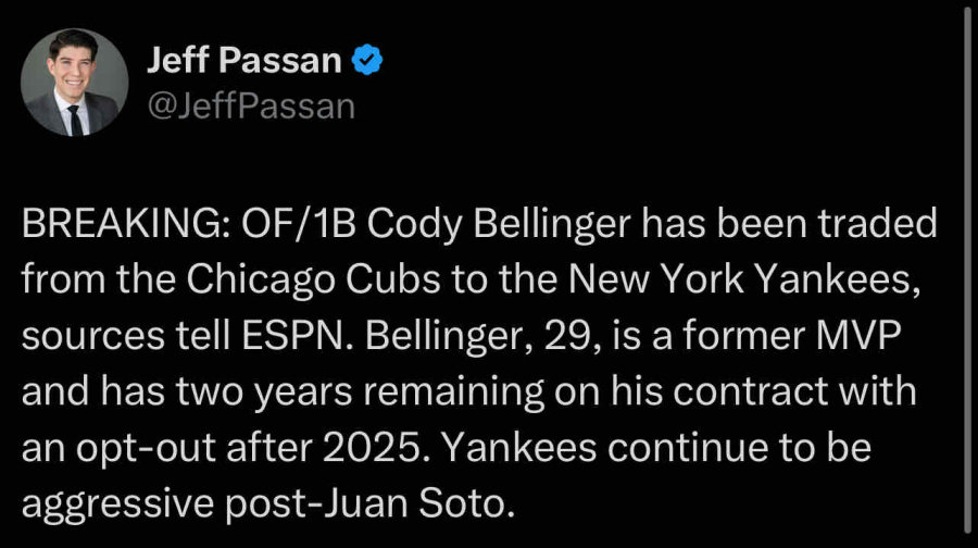 Full trade, per ESPN sources: Cody Bellinger and cash go to the New York Yankees, right-handed reliever Cody Poteet goes to the Chicago Cubs.