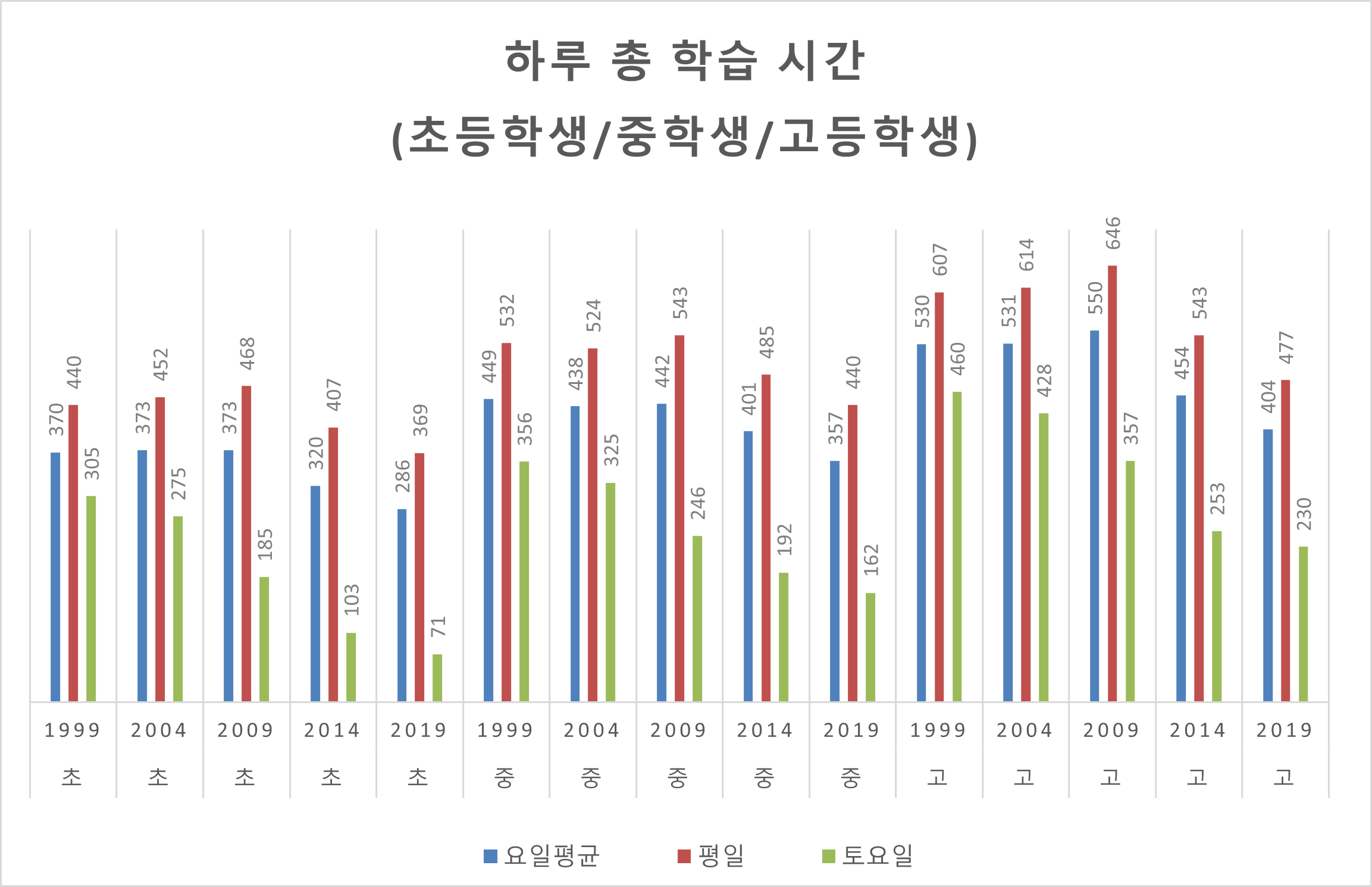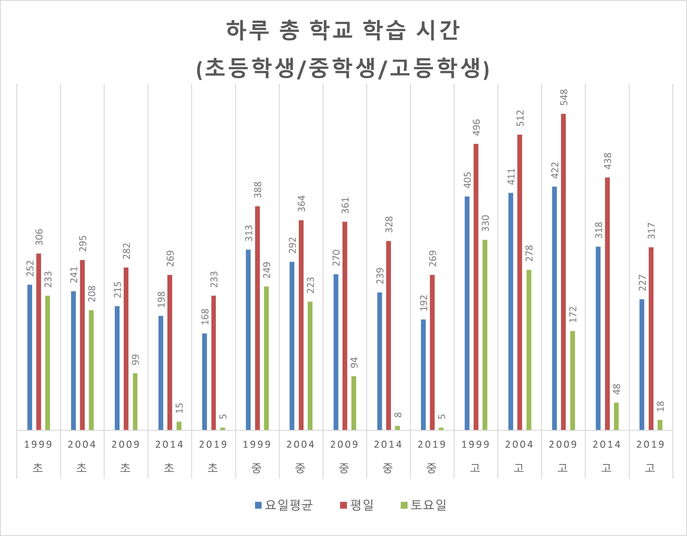 한국 교육의 변화와 문제를 말하는 사람들은 많은데, 데이터에 기반한 이야기가 많치 않은 것 같습니다. 특히 데이터 쪽 이야기가 드문 게 아쉬움. 그래서 생활시간조사 1999-2019년 데이터로 드러난 학습시간 변화를 중점으로, 한국 교육의 변화와 (잠재적) 문제를 이야기하고 싶습니다. 원 데이터엔 일요일도 있는데 가독성 문제로 제외했습니다. 2024년 데이터는 작년에 조사되어 올해 발표될 예정인데 어떨지 궁금하네요. ![]() 보시다시피 1999년부터 2009년까지는 초, 중. 고의 학습시간이 그대로 유지됩니다만, 그 이후 학습시간이 학교급을 막론하고 크게 감소합니다. 완전 등교일 -> 놀토/갈토 병행체제-> 완전 휴교일로 전환되는 과정에서 토요일 학습시간의 감소가 돋보입니다만, 평일도 감소세에서 예외는 아닙니다. 전반적으로 학습시간 자체가 2010년 이후 크게 감소하는 추세입니다. 참고로 이 학습시간은 학교 내, 학교 외를 합산한 수치라서, 학교 내와 학교 외를 분리해서 보겠습니다. ![]() 먼저 학교 내입니다. 학교 내 학습시간은 전체 학습시간과 마찬가지로 2009년까지 그대로 유지되다가 그 이후 크게 감소하고 있습니다. 완전 휴일화에 의한 토요일의 급격한 감소가 돋보이네요. 눈대중으로 감소폭은 전체 학습시간보다 더 큰 느낌입니다. 학생들이 새벽에 등교했다가 한 밤중에 하교한다는 한국 교육의 클리셰는 급격하게 과거의 일이 되어가고 있습니다. 개인적으로도 몇년 전에 모교를 어쩌다 지난 적이 있는데, 4시 무렵에 단체로 하교하는 학생들을 봤습니다. 저 땐 반강제적인 야간자율학습을 했는데, 별로 괴롭진 않았고 추억으로 남습니다만 보면서 많은 만감이 교차하는 건 어쩔 수가 없네요. ![]() 그런데 학교 외 학습시간(대부분이 과외나 학원, 자습일)은 트렌드가 좀 다릅니다. 초등학교는 패턴이 혼란스러워서 잘 모르겠는데, 중학교와 고등학교는 학교 외 학습시간이 갈수록 늘어나는 경향성을 보입니다. 중학교는 2000년대에 증가했다면 고등학교는 2010년대에 급격하게 증가했습니다. 특히 고등학교는 1인당 사교육비의 급격한 증가와 시점이 일맥상통합니다. 학교 내 학습시간의 급격한 감소, 그리고 학교 외 학습시간의 일부 증가는 주목할 만한 현상입니다. 비록 학습시간 전체가 줄었지만, 교내외 여부로 가르면 어느정도 대조가 되고 있는 겁니다. 이걸 전반적인 학습시간 감소와 결부지으면, 한국의 교육 변화와 (잠재적) 문제에 있어 많은 함의가 나타납니다. 첫째. 지금 아동, 청소년들은 더 이상 과거처럼 무식하게 많이 공부하지 않습니다. 2000년대까지는 한국 학생들이 무식하게 많이 공부한다는 클리셰가 통하지만, 2010년대부터는 아닙니다. 그러면서도 PISA 점수가 상대적으로 안정적으로 유지된 거라 매우 대단한 성취입니다. PISA 점수가 다소 하락했다고 볼 순 있지만, 전세계 최상위권에서 벗어나지 않는 한국 교육 성취의 우수성은 잃지 않았습니다. 코로나19로 전세계 공교육이 초토화되는 와중에 한국은 선방했습니다. 이는 좋은 의미로 일본을 따라가는 겁니다. 일본은 과거에 비해 공부시간은 많이 줄었지만(그리고 부활동은 늘어났지만), PISA 최상위권은 유지하고 있거든요. 그걸 가지고 동아시아가 단순히 무식하게 공부 많이해서 공부를 잘한다는 클리셰에 반론한 학자도 있습니다. 한국도 그 사례에 들어가고 있으니, 한국 더 나아가 동아시아 교육의 성취와 의의를 다시 돌아볼 때가 온 것 같습니다. 둘째, 한국은 '학교 안'에 한정하자면 너무 적게 공부해서 문제일 수 있는 사회가 되었습니다. 먼저, 한국의 교육시간 감소는 급격해서 교육과정 파행이 의심될 수준입니다. 수학 관련해서 배우는 내용이 많이 줄었다고 이공계인들이 반발하고 있는데, 이것과도 관련 있을 듯 합니다. 또한, 특히 고등학교에서, 교내 학습시간의 감소가 교외 학습시간(대부분은 과외, 사교육) 증가와 동시에 일어났습니다. 이는 교육 총량의 부분적인(총 학습시간은 분명 줄었으므로) 풍선효과를 암시합니다. 실증분석을 해봐야겠지만 가능성으로는 생각해볼 만 합니다. 어찌보면 근래 사교육의 급격한 증가의 한 원인일 수 있기 때문입니다. 단순한 학업 문제만은 아닙니다. 한국 초등학교는 타 선진국에 비해 일찍 하교하며, 이로 인한 보육 관련 여성 경력단절 문제가 심각합니다. 미취학 아동 경력단절은 많이 완화되었는데 취학연령 아동 경력단절은 상대적으로 감소세가 약합니다. 그래서 늘봄학교 정책도 나온 건데, 교내 학습시간이 너무 작아진 게 문제의 원인일 수 있다는 생각 정도는 해볼 필요가 있습니다. 2