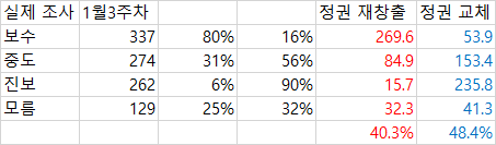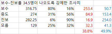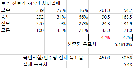 데일리 오피니언 제609호(2025년 1월 3주) - 장래 정치 지도자 선호도, 대선 결과 기대, 대통령 탄핵, 경제 전망 https://www.gallup.co.kr/gallupdb/reportContent.asp?seqNo=1537 [정당 지지도] 국민의힘 39%, 더불어민주당 36%, 무당(無黨)층 17% · 양대 정당, 12.3 비상계엄 사태 이전 비등한 구도로 되돌아가 · 8년 전 탄핵 국면 당시는 여당 분당, 범보수 진영 위축세 장기간 지속 [장래 정치 지도자 선호도] 이재명 31%, 김문수 7%, 홍준표·한동훈 6% · 오세훈 4%, 이준석 2%, 조국·김동연 1% · 선다형 아닌 자유응답, 유권자가 주목하는 인물 누구나 언급될 수 있어 [대선 결과 기대] 현 정권 유지(여당 후보 당선) 40%, 정권 교체(야당 후보 당선) 48% · 성향 중도층, 무당층은 교체론에 더 무게 [윤석열 대통령 탄핵] 찬성 57%, 반대 36% · 지난주 대비 20~40대 찬성 줄고, 보수층 반대 늘어 제가 그냥 이 결과를 바탕으로 '만약 오늘 대선이라면' 결과를 추론해 보겠습니다. 참고한 자료는 이번 총선 직전에 있었던 갤럽 결과, 그리고 작년 말에 공개된 갤럽 연간 종합결과(의 마지막표)입니다. https://www.gallup.co.kr/gallupdb/reportContent.asp?seqNo=1470 https://www.gallup.co.kr/gallupdb/reportContent.asp?seqNo=1534 [총선을 바탕으로 보정하기] 총선 직전에, 보수층숫자 - 진보층숫자 는 대략 11명 정도였습니다. 그리고 당시에 갤럽기준 여당에 투표하겠다 40%, 야당에 투표하겠다는 50%이었고 당시 국힘 후보가 지역구에서 득표한 비율은 45% 민주당 후보가 지역구에서 득표한 비율은 50%가량 됩니다. 그리고, 여당 투표의향 - 야당 투표 의향이 갤럽 결과로는 -10%였는데 실제로는 -5%였습니다. 그러니까, 여당 투표의향 - 야당 투표의향을 갤럽결과를 바탕으로 유추하기 위해서 보수 / 진보의 숫자를 강제로 조정하여, 실제 결과를 재생산하기 위해 숫자를 조작해 보겠습니다. [지난 4월 실제 갤럽 조사 결과] [갤럽 조사 결과를 총선결과값에 부합하도록 강제 조정한 결과] 보수 - 진보의 숫자를 34.5명으로 강제로 조정하자 실제 결과와 매우 유사한 수치가 도출 되었습니다. 보수가 진보보다 34.5명이어야 정상값이라는 수치는 갤럽의 2024년 연평균 보수-진보 값인 20.8명이라는 수치와도 크게 차이가 나지 않고 매월 보수-진보 값의 표준편차값인 ±27.3명 이내에 있으므로 합리적인 수치라고 (내맘대로) 가정하겠습니다. 12월의 값이 튀었으므로 그것만 빼고 계산해보아도 12월을 빼고 11개월을 계산한 평균값인 27.3명, 11개월분의 표준편차값인 ±17.1명 기준으로 생각해보아도 튀는 수치는 아닙니다. [보수 과표집을 보정해보기] 34.5명이라는 숫자를 바탕으로 이번주 갤럽 대선 투표 의향 결과를 맘대로 보정해 보겠습니다. [1월3주차 실제 갤럽 조사 결과] [34.5명이라는 계산된 수치에 부합하도록 강제 조정한 결과] [[맺음말]] 1 보수 과표집이 실제인지 아닌지는 따지지 않았습니다. 그리고 그런거 실제로 없는거나 마찬가지라고 하는 여조 전문가들도 꽤 있습니다. 최근에 리얼미터 이택수 대표는 배종찬 대표와 함께 CBS유튜브 방송에 출연하여 '뉴스공장의 김어준 총수가 원래 과표집이라는 단어를 처음 만든 사람인것으로 안다'라고 언급하며 '나는 개인적으로 과표집이라는 개념이 실제로 있는 개념이라고 생각하지 않지만 뉴스공장에서 이런소리 하면 욕먹기 때문에 굳이 뉴스공장에서 그걸 지적하지는 않는다'라고 매우 최근에 언급한 사실이 있다는 것도 덧붙이겠읍니다. https://www.youtube.com/watch?v=rO0qZQxsvzo 2 저는 통계를 이런식으로 맛사지해도 되는지 안되는지 모릅니다. 그냥 과표집이라는 말이 핫하기 때문에 흥미로워서 해본 것입니다. 애초에 제가 정한 34.5명이라는 수치가 합리적이라는 확신도 없고...... 하지만 그냥 궁금하니까 내멋대로 한번 계산해보았으빈다. 1