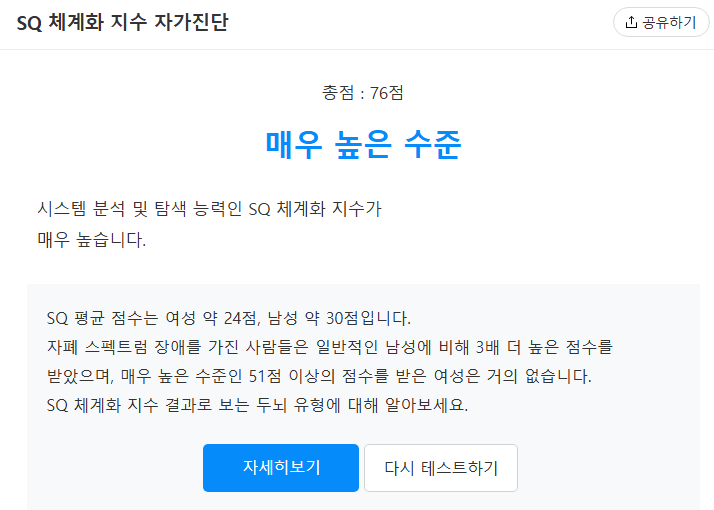 ※ 참고로 책 부록의 간이 검사지는 여기에 있습니다. (책 내용을 정리하는 김에 블로그를 만들었습니다. 체계화 능력이 자폐나 유전과 관련이 있다면, 자폐인 형제가 있는 원 가족과 이제 시작한 제 가족의 이야기이기도 하니까요. 홍차넷에는 블로그에 적은 내용 중 일부를 최대한 간결하게 적으려고 합니다. 이미 상단의 유투버 요약 이미지도 훌륭하고, 또 기니까요. 성별 분포, 자폐인과 연관성 등 자세한 이야기가 궁금하신 분들은 블로그에 추가 정보가 있습니다. ☞ 바로가기 '고도로 체계화하는 성향과 자폐의 연관성' ) 제 인터넷 검사의 결과는, SQ는 76점으로 매우 높은 수준이나, EQ는 36점으로 보통 수준입니다. 책의 간이 검사로는 SQ는 19점 EQ는 8점으로 극단S형입니다. 개인적으로 이 테스트가 제게는 몹시 즐거웠습니다. 저를 알아봐주는 사람이 있구나 싶은 심정이었거든요. 물론 저는 '극단 S형'의 전형적인 모습에는 해당되지 않는 면도 있습니다. 혼자보다 사람들과 지내는 것을 좋아하고, 먼저 인사하고 먼저 스몰토크를 시작하는 편이거든요. 그렇지만 무엇보다 연애에 있어서 제가 가진 의문이 조금은 풀리는 느낌이었습니다. 책에서는 비슷한 사람끼리 끌릴 수 있다고 하는데 (아니면 사회성이 부족해 늦게까지 남아 있다 서로를 발견하거나ㅠ) 저는 '고도로 체계화 하는 성향'이 강한 사람을 연애 상대로 꺼려했거든요. 물론 같이 세부적인 내용까지 파고든 이야기를 하거나 할 때는 즐겁고 신났으나 그 뿐이고, 오히려 연애에 대하여는 흡사 '근친상간'과 비슷한 감정을 느꼈었습니다. 감정은 강렬한데 원인은 알 수 없어서, 늘 에둘러 표현하곤 했습니다. "나와 비슷한 전공은 좀...", "남자의 직업과 학벌보다는 외모를 본다", "남자의 눈물에 약하다." 등등 저는 본능적으로 감성적인 면모가 강한 사람을 찾고 있었던 것 같습니다. 어쩌면 단순 취향이었을 수도 있고요. (그러기엔 좀 지나쳐서 스스로 의아했습니다) 다른 분들은 어떨지 궁금합니다. 혹시 결혼 전이고 본인의 체계화 지수가 높다면, 최대한 감성적인 사람을 찾으시길...(※ 주의 : 결론이 몹시 자의적임)