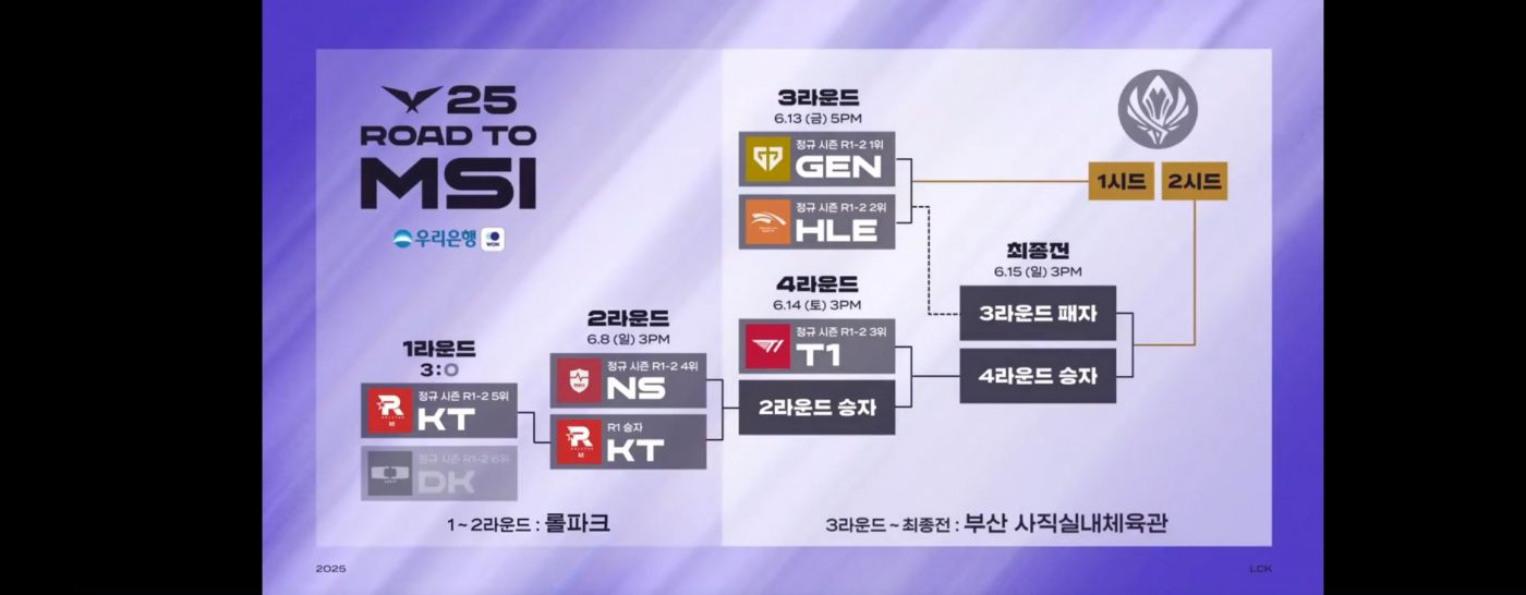 2025 LCK Road to MSI(이하 RtM으로 명명) 2라운드(5판 3선승제, 롤파크) 15 : 00 NS vs KT 금목서 속 은목서 : 와 3일 간 소문난 잔치 큰 거 온다 하고 기대했는데 셧아웃 이라니ㅡㅡ 제가 보기엔 농심의 상위 호환이 킅인데( -_-) 낼도 셧아웃 은 아니겠지 0