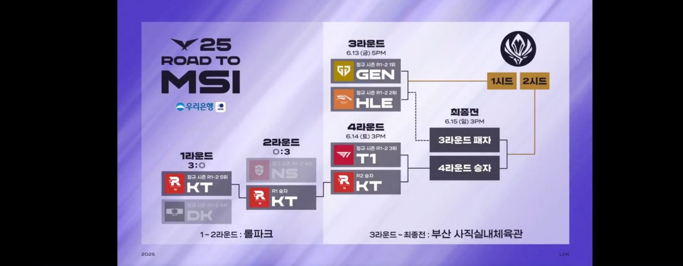 2025 LCK Road to MSI(이하 RtM으로 명명) 3라운드(5판 3선승제,부산 사직체육관,25.11버전 ) 17 : 00 Gen.G vs Hanwha Life Esports 금목서 속 은목서 : 미리 올립니다 그런식으로 셧아웃 맞추면 어쩌냐ㅡㅡ 비 많이 안 와야할텐데;;; 0