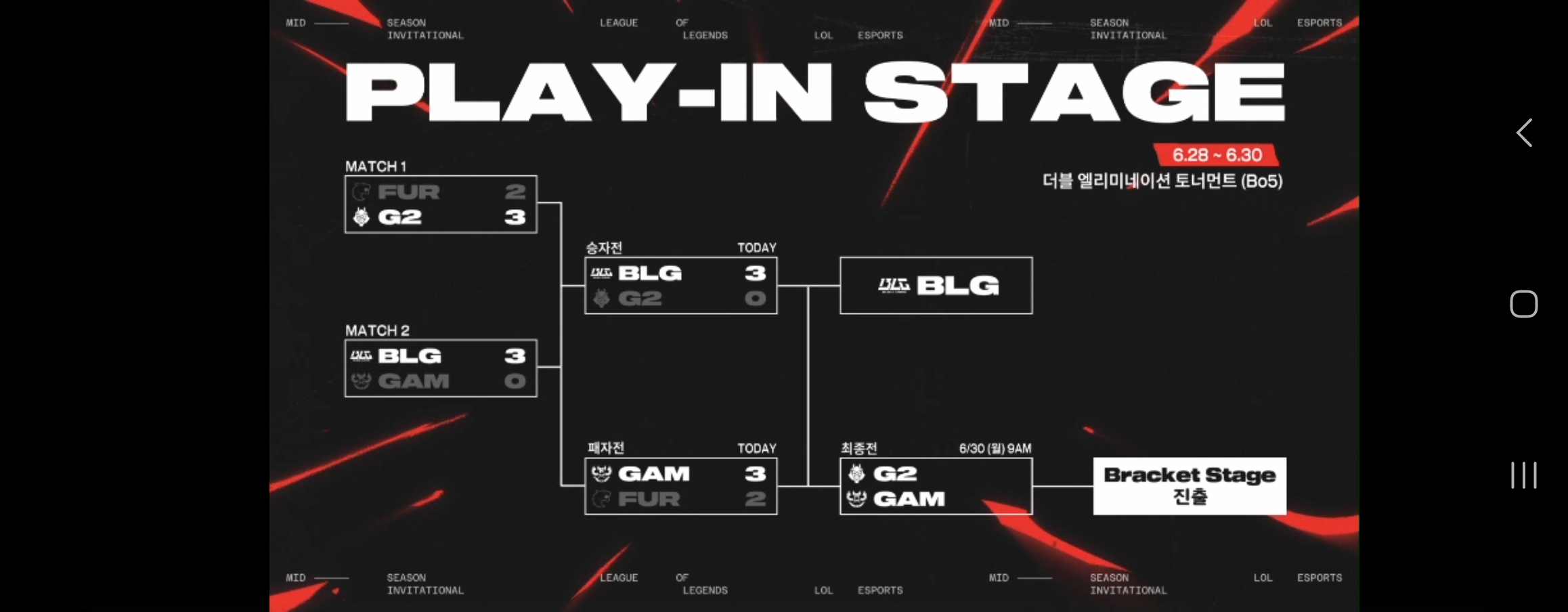 2025 Mid-Season Invitational 플레이-인 스테이지 3일차 밴쿠버 Pacific Coliseum (패치 버전 25.13,5판 3선승 더블 엘리미네이션 토너먼트) ※최종전 (아침)09 : 00 GAM Esports vs G2 Esports 금목서 속 은목서 : 단톡방 진동 때문에 일어났읍니다 감사하읍니다 경기 후 브래킷 스테이지 대진표 추첨을 하읍니다 이번달 저한텐 골든 리트리버급의 활동량이었읍니다 다시 잘랍니다 0