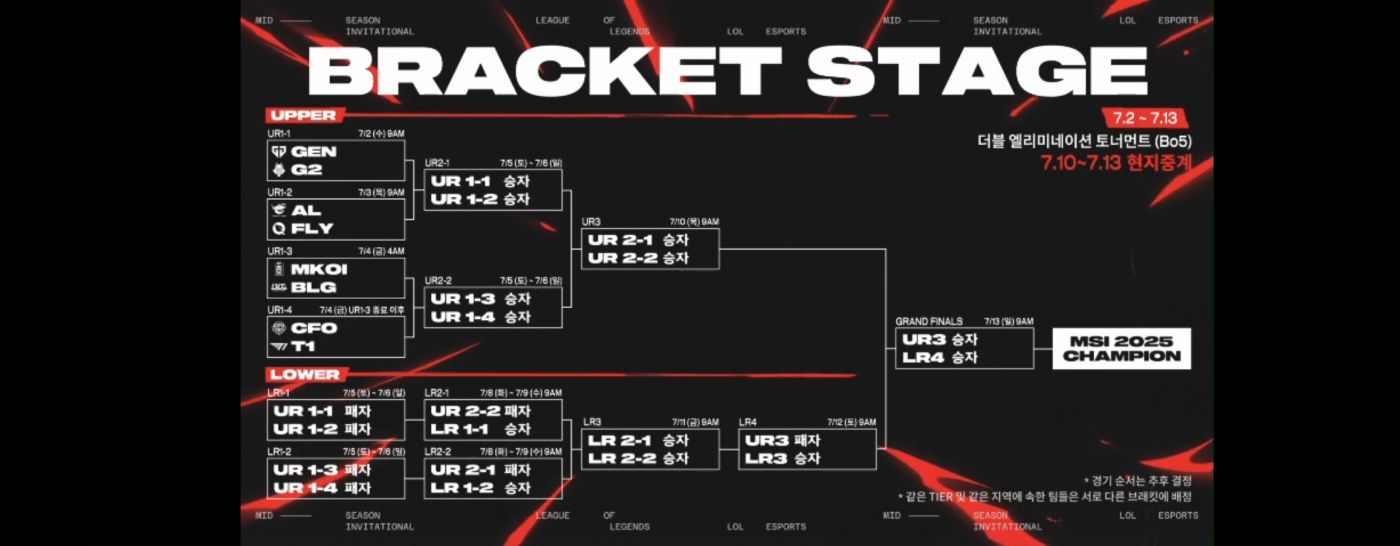 2025 Mid-Season Invitational 브래킷 스테이지 1라운드 1일차 밴쿠버 Pacific Coliseum (패치 버전 25.13,5판 3선승 더블 엘리미네이션 토너먼트) (아침)09 : 00 Gen.G vs G2 Esports 금목서 속 은목서 : 브래킷인가, 브래켓인가, 브래캣인가 이거 하나에 왜 고민을 하고 있는가 사진 오른쪽에 있는 규정과 같은 지역은 승자조 결승까지 못 만나는 규정에 따라 G2가 올라와서 대진표 추첨 읍이 확정 됐읍니다 3일 연속 5꽉 한 G2는 시차 적응이 됐는가ㅡㅡ 설마 5꽉 가진 않겠지?? 0