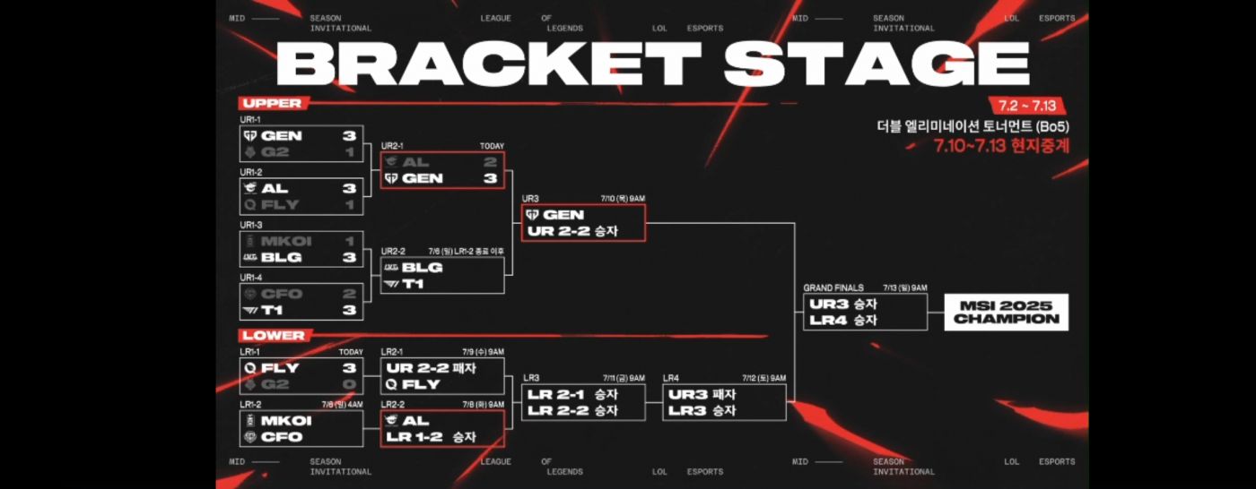 2025 Mid-Season Invitational 브래킷 스테이지 2라운드 2일차 밴쿠버 Pacific Coliseum (패치 버전 25.13,5판 3선승 더블 엘리미네이션 토너먼트) ※패자조-1라운드 2일 (새벽)04 : 00 Movistar KOI(약칭 MKOI) vs CTBC Flying Oyster ※승자조-2라운드 2일 (앞경기 빨리 끝나면 이어서 바로)(아침)07 : 30 Bilibili Gaming DreamSmart(약칭 BLG) vs T1 금목서 속 은목서 : 패자조 먼저합니다.지면 집에 가구요 남타커면 갠춘한데 스스로 타먹다보니 넘 커피를 많이 마셨나봅니다;;; 속쓰려서 먼저 잡니다 월욜에 경기 없읍니다 0