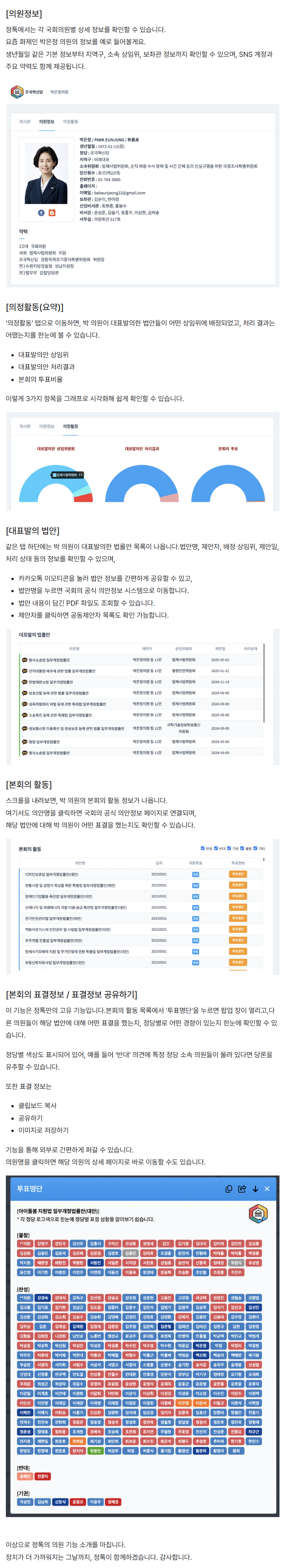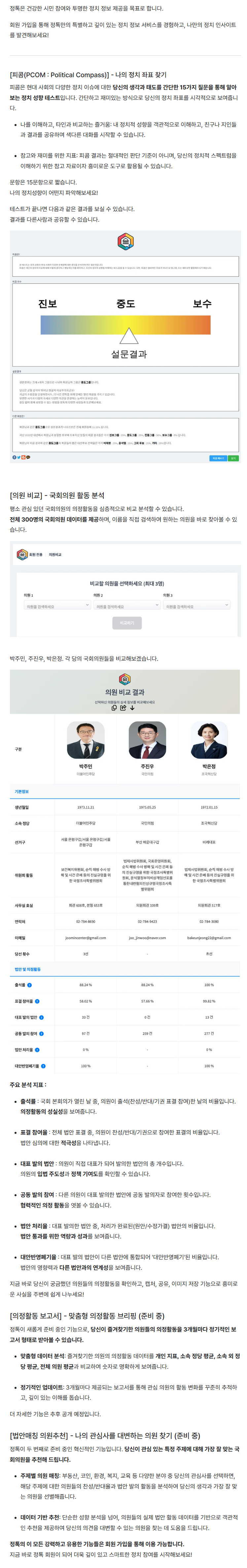 안녕하세요. 홍차넷에서의 첫 글입니다. 오랜 타사이트 유저로서, 비슷한 느낌이 나네요. 오히려 타사이트는 예전 그대로 멈춰있는데, 홍차넷은 많은 발전이 있는것 같습니다. 맛집에 제가 운영한 예전 가게도 올라오고.. 종종 들리도록 하겠습니다. ^^ 일단.. 문제가 된다면 삭제하겠습니다. (또는 삭제해주세요 운영자님) 남겨도 될지 문의글 쓸곳도 못찾았고.. (홍보금지 규정은 봤지만 사적 이익추구 목적으로 들어갈지 판단 부탁드립니다. 운영장님) 전 개발자이고, 퇴근후에 1~2시간씩 몇년간 개발했어요. (생각나면 하다가, 또 본업에 잊고지내다가.. 반복) 데이터는 공공데이터를 수집, 가공해서 새로운 데이터로 보여주고, 기존 텍스트의 데이터를 쉽게 보여주려고 노력했어요.. 정치와 입법에 대해서 하나도 모르는 상태에서 개발해서.. 부족한것도 많고.. 부족한것도 많고..부족한것도 많고.. 나름 제가보기엔 적당히 잘 만든거 같아서.. (저만의 생각) 사이트에서 제공하는 기능을 말씀드릴게요. 기능을 텍스트로 나열하는것보단, 제가 다른곳에 작성한 내용의 이미지를 보여드리겠습니다. 사이트 이름은 '데이터와 함께하는 즐거운 정치커뮤니티! 정톡!' 입니다. 줄여서 '정톡' 입니다. 다른곳에도 있는 기능들도 많지만, '시각화된 표결 정보'라든가 '국회의원 의정활동 비교'는 국내에 다른 사이트에는 없는거 같더라구요. 부족하지만, 편하게 보시고 많은 관심과 피드백 부탁드립니다. 감사합니다. * 문제가 된다면 삭제하겠습니다. 홍보시작! ----------------- 16