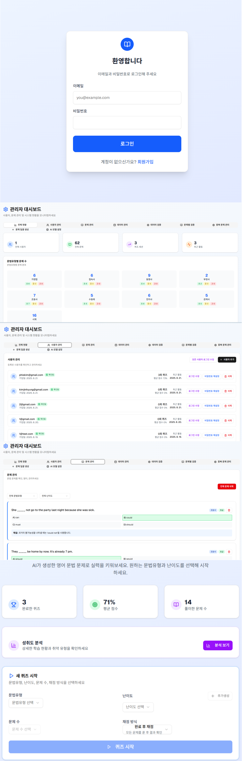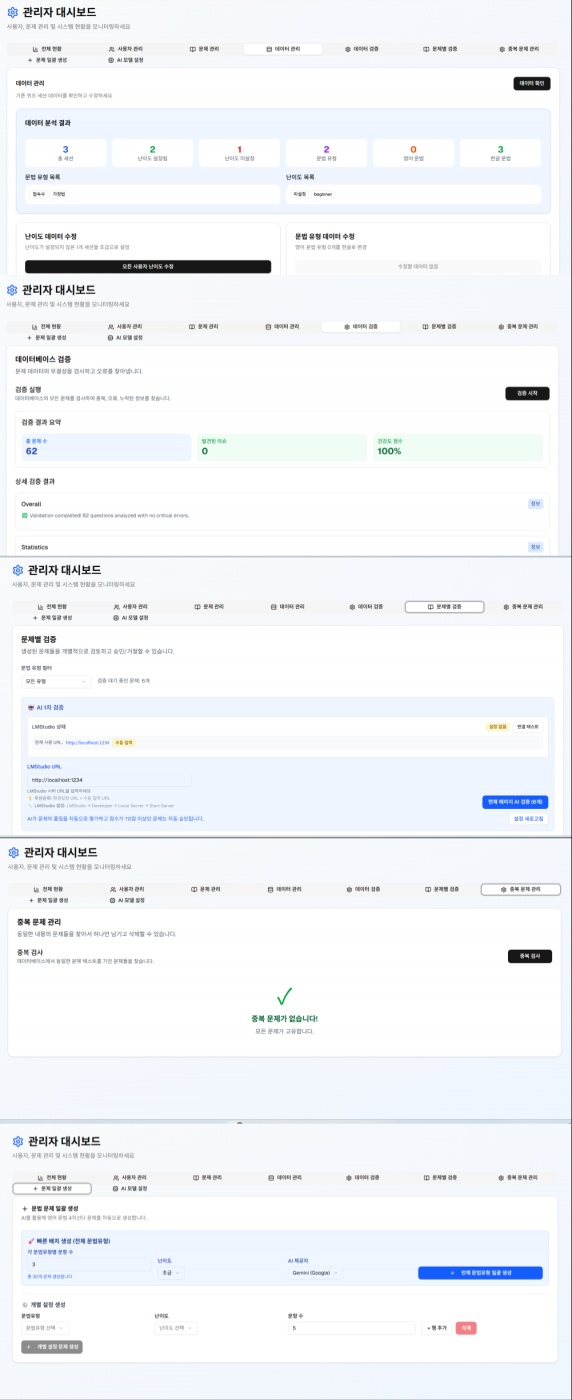 최근 영어시험을 준비할일이 생겼습니다. 그래서 문제집도 풀고 엑셀로 정리도 하고 하다가 아.. 좀 귀찮네 편하게 할 방법 없을까? 결국 만들어버렸습니다. ㅎㅎ 일단 사이트 이름은 영어문법이니까 enggram.vercel.app 이고요. pc와 모바일 다 지원합니다. 예전에 써봤던 토익앱?비스무리하게 해보려고 했는데 돈내고 하고 싫어서 직접 만들었어요. ㅋㅋㅋㅋ AI 기능도 넣었습니다. 대략 기능은 90프로 정도 된것 같아요. 로그인후 원하는 유형과 급수를 선택하고 테스트하시면 됩니다. 계정도 만들어놓았어요 퀴즈방식도 다풀고 채점,즉시채점 두개 다 넣었어요.ㅎㅎ 아이디는 demo@demo.com 패스워드는 demo 말그대로 데모지만 뭐 제한은 없습니다. 아직 데이터가 많지 않아서 ㅎㅎ 중3 아들놈 시켜보니 나쁘지 않다네요 ㅋㅋㅋ 개발자로 인정 받았습니다. 이번주 내내 짬짬히 ㅋㅋㅋㅋ 그래도 뿌듯합니다. 18