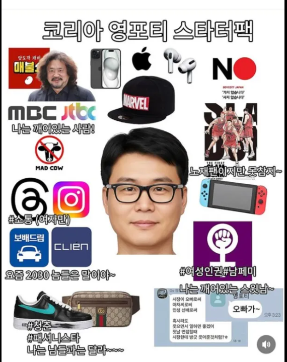 개인적으로 '영포티'라는 놀림에 긁히지 않는 이유가 뭘까 잠깐 생각해 봤습니다. 결론은 다른 세대론엔 이념과 정치 성향, 태도나 행동에 대한 공격까지 따라붙는 게 보통인데, 저 호칭엔 그런 게 없거나 운 좋게 세탁(?)되었고, 남은 것은 이질성이 아닌 동질성에 대한 자각과 두려움뿐인 호칭이 되었기 때문 아닐까 싶어요. 민주화운동 업적 하나로 온갖 기득권을 누리는 86세대, 개인주의적이고 무책임한 X세대, '젠지 스테어'처럼 SNS라는 판옵티콘 속에서 행동 하나까지 특정 지어 비판 받는 뉴밀레니엄 세대 등은 물론이고, 한남 한녀 같은 노골적 멸칭은 물론 과거의 아저씨, 아줌마 같은 일상적 단어 안에도 온갖 부정적이고 불쾌한 행동양식이나 편견들이 덕지덕지 붙어있었죠. 영포티도 초기엔 진보 성향, 여성에게 스윗한(ㅋㅋ) 태도까지 함께 욕을 먹었지만.. 윤계엄님의 인류사급 자책골과 이어진 보수의 자멸 속에 성별 이슈도 잠잠해지며 나름의 정당성이나 활기를 확실히 잃어버린 느낌입니다. 그렇다면 남은 건.. 최근 쇼츠로 열심히 희화되듯 탈모를 가리거나 일과 후나 주말엔 손질이 귀찮아 눌러 쓴 스냅백, 젊은 시절의 패션과 문화 및 IT 취향을 고수하며 애써 ‘젊은 척한다’라는 오해 뿐인데... 사실 이건 이질성에서 비롯된 혐오나 놀림이 아니라 동질성에 대한 자각이나 예감에서 출발한 반응이잖아요. 노화, 자신보단 가족을 가꾸고 건사하는데 할애될 돈과 에너지, (때문에) 젊어서 만들어진 취향의 고착까지... 이건 자신과 갈라치고 타자화 할 수 있는 특징이 아니라 그냥 인류라는 종의 성숙과 노화에 따라붙는 생물학적 특징에 가까운 부분이니까요. 결국 지금의 영포티란 용어는 ‘그들은 우리와 다르고 열등해!’가 아니라, ‘쟤들이 나와 같다니 불쾌해! or 나도 저렇게 될까 봐 무서워!’라는 자각과 공포를 보여주는 부분도 있다고 생각해요. 현 영포티 = 구 X세대가 선점한 스마트폰과 아이돌 문화, 브랜드 등이 자신들의 일상과 옷장과 장바구니 속에도 들어있음을 자각하며 느끼는 불쾌함 같은 것? 무엇보다 최소 삼촌, 최대 부모의 입장에서 젊은 세대가 자신들의 조던, 스냅백, 진 패션, 비틀즈와 오아시스, 슬램덩크와 웨스 앤더슨에 이어 텍스트힙까지 관심을 갖는 모습을 확인한 영포티 당사자들은 다소 여유로운 반응을 보일 수 밖에 없는 게 아닌가, 하는 생각이 들었습니다 ㅋㅋ 1