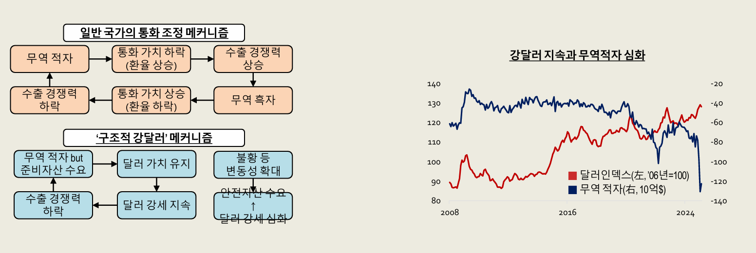 여기에서 문제가 생깁니다. 모순된 정책이 등장할 수밖에 없다는 겁니다. 예를 들어, 기축통화로서의 달러 패권을 유지하려는 시도는 달러 강세를 만들어내고, 이는 제조업 부흥을 제약하는 요소가 됩니다. 지금 미국의 여러 정책이 갈팡질팡하는 모습이 나타나는 것처럼 보인다면 기분탓...아니 바로 이런 탓입니다.