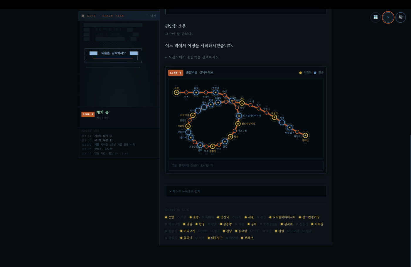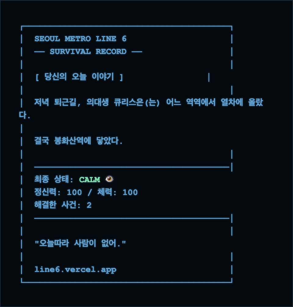 지난번 쓰던 제소설 소개 게임테마를 보다가 문득 생각이 나서 만들었어요.어...이거 지하철게임 어떨까? 그 작은 상상에서 출발해, 레트로 아스키아트(ASCII) 감성을 듬뿍 담은 웹 브라우저 기반의 텍스트 생존 어드벤처 게임, **<서울 지하철 6호선 — 탈출 어드벤처>**를 만들었습니다. 🕹️ 어떤 게임인가요? 응암순환행부터 봉화산역까지 총 38개의 역을 지나는 동안, 여러분은 매 역마다 마주치는 기괴하고 예측할 수 없는 지하철 내 이벤트들을 선택지로 헤쳐 나가야 합니다. [주요 특징] 🩸 3대 생존 스탯: 체력, 정신력(Sanity), 감염도를 밸런스 있게 관리해야 합니다. 버티지 못하고 정신력이 바닥나면 멘탈이 무너지며 화면 속 아바타의 표정과 대사가 미쳐갑니다(...). 💼 직업과 전용 소지품: 형사, 간호사, 야간 알바생, 버스킹 뮤지션 등 20여 종의 직업에 따라 시작 아이템이 주어집니다. 학생은 교과서를 챙기고 식당 실장님은 주문서를 챙깁니다. 이 작은 소지품 하나가 특정 상황에서 생사를 가를 수도 있습니다. ⏱️ 시간대 시스템: 출근길 러시 아워, 한산한 낮, 취객이 붐비는 막차 시간대 등 '언제 탑승했느냐'에 따라 열차 안의 상황이 완전히 다르게 전개됩니다. 📜 게임 속의 게임, "생존형 한자 퀴즈" (개발자 강추!) "다음 역은 상월곡, 상월곡역입니다." 원래는 '역명 유래 한자'를 알려주는 교양(?) 기능을 넣으려다... 기왕 생존 게임인 거, 이걸 생존 시스템에 편입시켰습니다. 열차가 역에 도착하면 확률적으로 '역명 한자 뜻 퀴즈'가 등장합니다. 정답 시: "아, 이런 뜻이었지. 알고 있으면 덜 무섭다." 👉 정신력 회복 (+5) 오답 시: "내가 매일 타는 이 역에 대해 아는 게 아무것도 없다..." 👉 미지의 공포로 정신력 타격 (-3) 단순히 한자 모양만 보고 '같은 그림 찾기' 꼼수를 쓸 수 없게, 선지에는 한자를 아예 숨기고 오직 **'음과 뜻'**만 제시됩니다. 심지어 오답들도 *'항상 상, 한 달 월, 굽을 곡'*처럼 글자 수와 음이 완벽하게 똑같은 악랄한 동음이의어들로 직접 꽉꽉 채워 넣었습니다. 살아남으려면 뛰어난 직감으로 때려 맞추거나, 이참에 진짜 지하철 한자 공부를 하셔야 합니다. 🤣 🔗 링크 및 후기 별도의 앱 설치 없이 모바일/PC 브라우저에서 바로 플레이 가능합니다! (이어폰을 꽂고 레트로한 타자기 효과음을 들으시면 몰입도가 200% 상승합니다.) 👉 플레이 링크: https://line6.vercel.app/ 게임을 마친 뒤에는 (살아남든, 미쳐버리든) 본인만의 '생존 기록'을 영수증 형태의 레트로 아스키아트 이미지로 캡처해 저장하실 수 있습니다. 오늘 퇴근길 지하철 안에서, 혹은 자기 전 침대 위에서 여러분의 생존 본능을 시험해 보세요. 버그 제보나 더 무서운 6호선 괴담 아이디어는 언제나 환영입니다! 감사합니다. 1