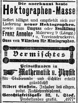 Privatstunden in ☞ Mathematik u(nd) Physik für studierende und Schüler erteilt gründlichst Albert Einstein, Inhaber des eidgen(össischen) polyt(echnikum) Fachlehrerdiploms, Gerechtigkeitsgasse 32, 1. Stock. Probestunden gratis. 개인 교습 ☞ 수학과 물리학 전 학년 학생 대상으로 철저한 지도. 알베르트 아인슈타인 (스위스) 연방 이공학 교사 자격증 소지. 게레히티크카이츠 가(街) 32번지, 1층. 시범 강의 무료. --- 얼마 주면 이 사람에게 과외받을 수 있나요? cf. https://namu.wiki/w/%EC%95%8C%EB%B2%A0%EB%A5%B4%ED%8A%B8%20%EC%95%84%EC%9D%B8%EC%8A%88%ED%83%80%EC%9D%B8#s-2.3 0