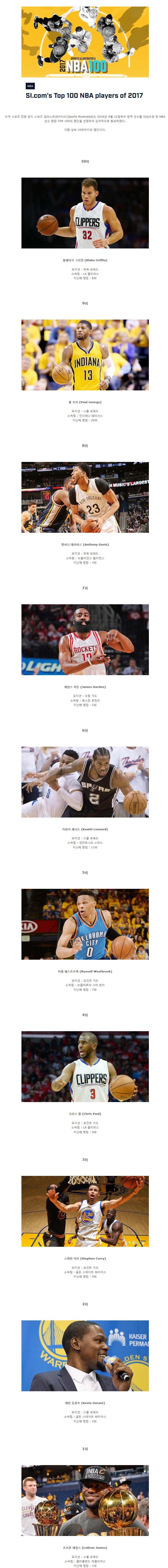 | Subject | 스포츠 일러스트레이티드 선정 2017 현역 NBA 선수 랭킹 TOP 10 |