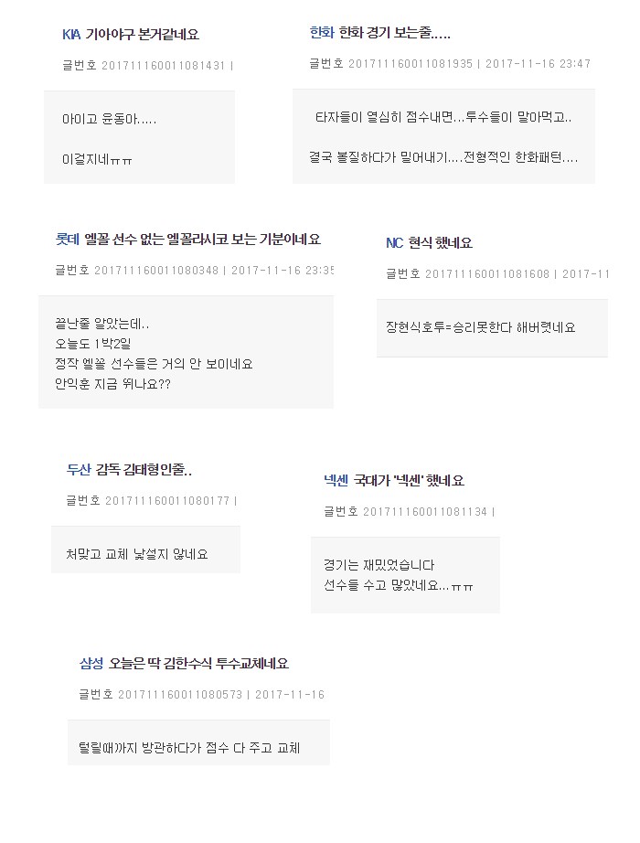 27177 어제 야구 국대경기 각 구단 팬들 반응 모음 1 tannenbaum 17/11/17 3961 0