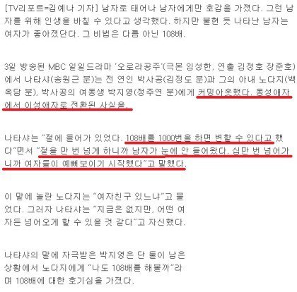 긍까... 제가 절에 가서 108배를 1천번 하면 여자가 좋아진대여 글쎄~~