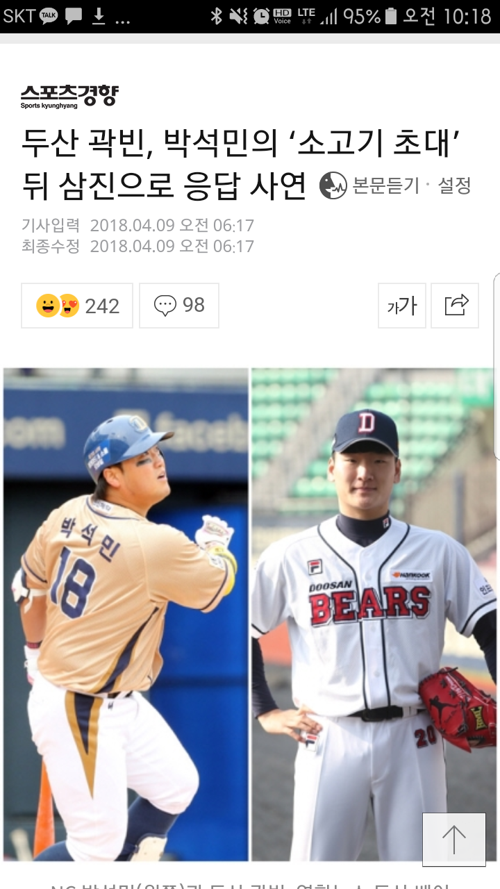 1. 신예 곽빈이 고딩 때 박석민 선배를 좋아하고 본받고 싶다 인터뷰 함 2. 박석민이 타팀이지만 격려 차원에서 비싼 소고기집에서 한우 멕임 3. 곽빈은 고기발로 다음날 박석민에게 삼진 멕임 소고기를... 그것도 한우를... 0