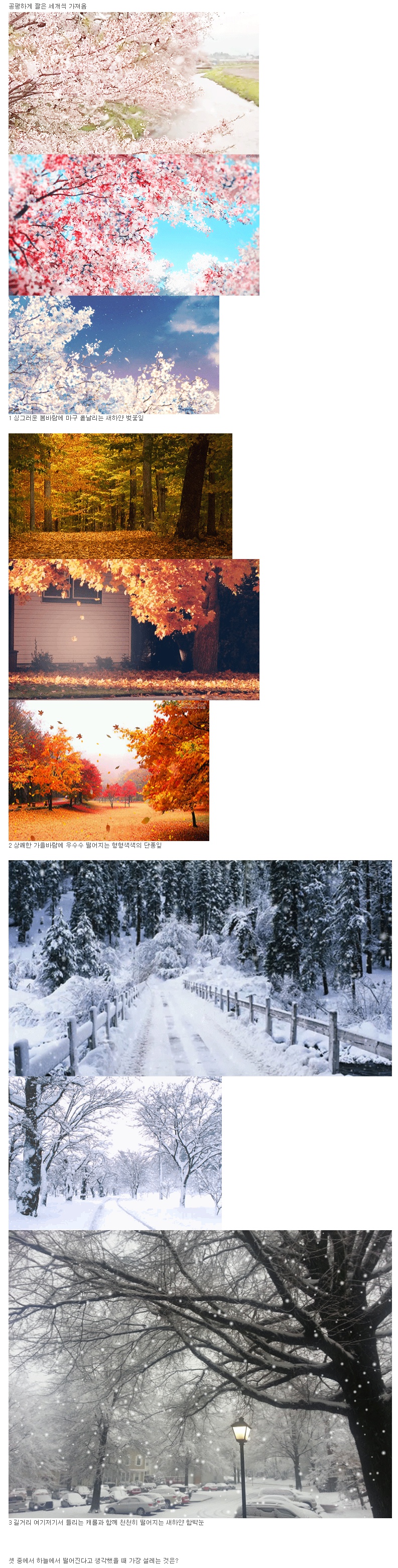 | Subject | 벚꽃 vs 단풍 vs 함박눈 이 세가지 중에서 하늘에서 마구마구 흩날린다고 상상했을때 가장 설레고 벅차오르는 것은?.jpg |