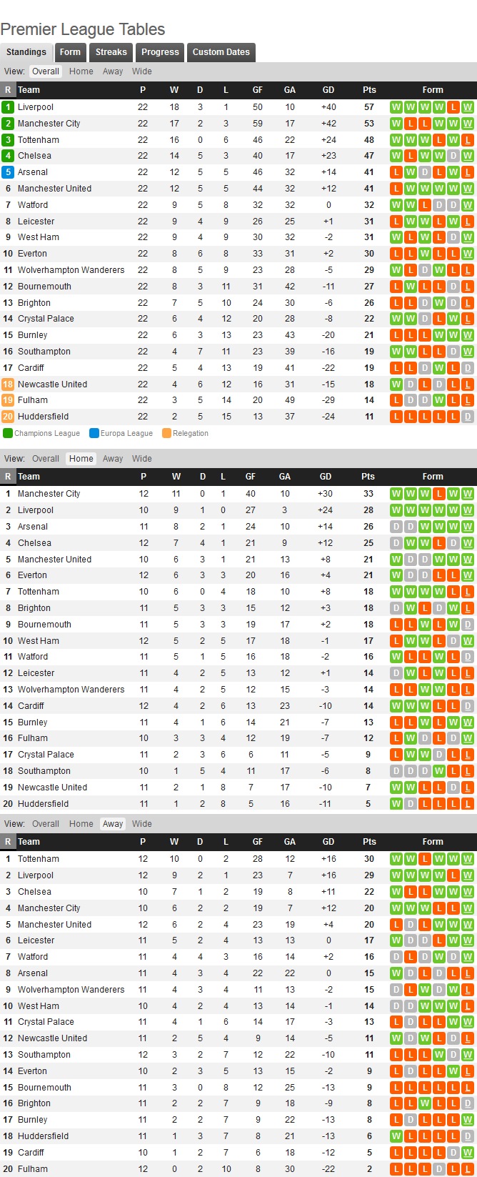 어쨌든 이번 시즌 아스날의 페이스는 저번 시즌만큼의 압도적인 기록은 아니지만 꽤 준수한 홈 기록과 저번시즌보다는 나아졌지만 여전히 엉망인 원정 기록이 상쇄되어서 결국 오십보 백보 상황에 머물러 있다고 볼 수가 있겠죠. 이번 시즌은 원정 경기에서도 괜찮게 하다가 최근 5경기에서 전부 승리를 놓치며 지난 시즌의 악몽을 떠올리게 하고 있습니다. 북런던 옆동네 팀은 경기 수가 다르다지만 원정 승점을 2배나 쌓고 있으니... 아스날보다 원정 경기 실점이 많은 팀은 프리미어리그에 단 두 팀입니다. 본머스와 풀럼. 가뜩이나 수비진 퀄리티로 고생하는 팀인데 그마저도 줄줄이 돌아가면서 눕고 있으니 에메리 입장에서도 속이 탈 듯. 현실적으로 4위를 가지고 첼시, 맨유와 함께 경쟁해야하는 상황에서 후반기 원정 성적은 아스날의 유로파 성적만큼이나 꽤 지켜볼만한 포인트일듯 하네요.
