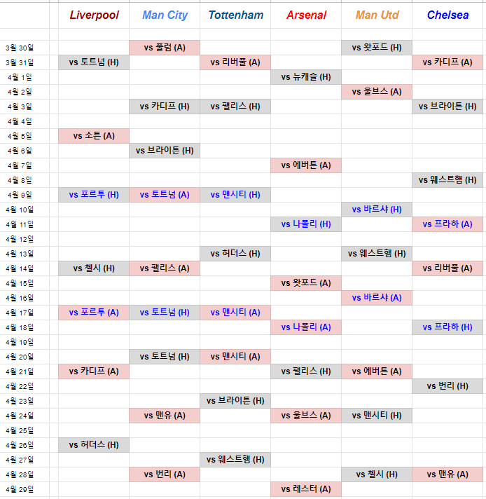 대신 그것에 대한 반대급부가 4월 일정인 셈이려나요. 많은 팀들의 일정에 유럽대항전이나 컵 대회가 아니더라도 주중 경기 일정들이 들어섰고, 특히 모든 컵 대회에서 순항중인 맨시티 같은 경우에는 크게 쉬지도 못했는데 4월 일정까지 꽉꽉 들어찼습니다. 선두 경쟁이든 챔스 경쟁이든 막판에 정신 차리지 못하면 훅훅 미끄러지기 딱 좋은 일정들인듯.