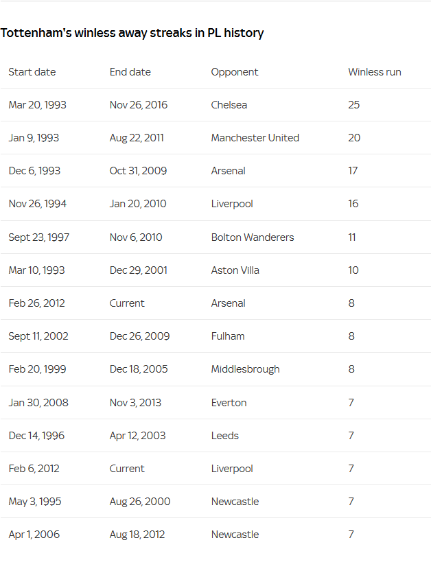 그 이후로 토트넘은 안필드에서 7경기를 치르는동안 승리가 없습니다. 이번에도 이기지 못하면 8경기 째로 현재 진행중인 원정 무승 목록에 아스날과 이름을 같이할 예정.