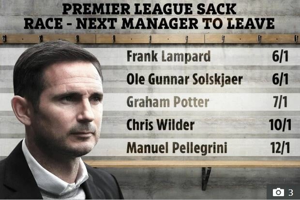 https://www.thesun.co.uk/sport/football/9435056/chelsea-manager-lampard-favourite-to-be-next-premier-league-boss-sacked/ Premier League Sack Race - Next Manager to Leave Chelsea Frank Lampard - 6/1 Man United Ole Gunnar Solskjaer - 6/1 Swansea City Graham Potter - 7/1 Sheffield Utd Chris Wilder - 10/1 Westham Manuel Pellegrini - 12/1 Watford Javi Gracia - 14/1 Everton Marco Silva - 14/1 Southampton Ralph Hasenhuttl - 16/1 Norwich City Daniel Farke - 16/1 Arsenal Unai Emery - 20/1 Crystal Palace Roy Hodgson - 25/1 Leicester City Brendan Rodgers - 25/1 Aston villa Dean Smith - 33/1 Wolverhampton Nuno Espirito Santo - 40/1 Bournemouth Eddie Howe - 40/1 Burnley Sean Dyche - 50/1 Tottenham Mauricio Pochettino - 66/1 Man City Pep Guardiola - 100/1 Liverpool Jurgen Klopp - 100/1 배당 출처는 betfair 램파드는 구단 최고급 레전드의 위치에도 불구하고 솔샤르와 함께 경질 배당률 1위로 시즌을 시작하는 모양새. 프리미어리그 1라운드에서 이 두 팀이 서로 맞붙는걸로 시즌을 시작한다는게 유머의 완성입니다. 역시 섬나라 주말 예능 클래스... 0