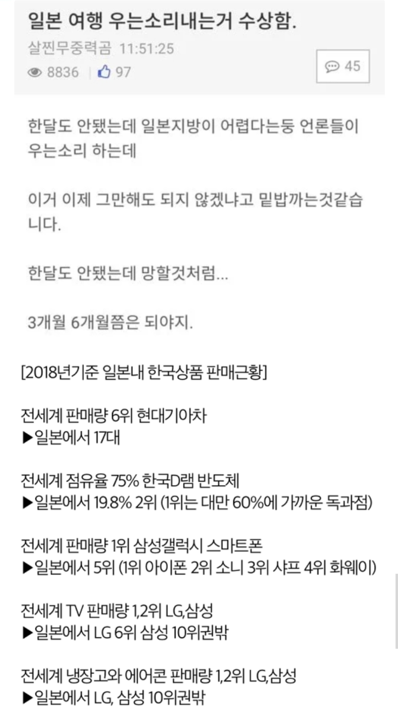 유별난 자국제품 사랑때문인줄 알았는데 그것에 더불어 수입장벽도 있었네요. 일본, '수출규제' 앞서 몇년간 한국산 제품에 수입장벽 쌓았다 https://www.yna.co.kr/view/AKR20190713039500003 0
