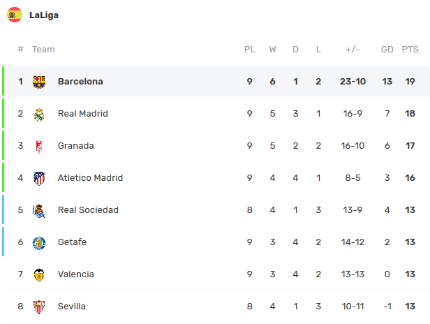2019. 10. 19. Eibar 0 - 3 Barcelona (Griezmann 13', Messi 58', Suarez 66') 3골 모두에 직접적으로 연관이 되면서 MSG(?) 트리오의 가능성을 선보인 그리즈만. 2019. 10. 19. Mallorca 1 (Junior Lago 7') - 0 Real Madrid 로테이션을 대거 돌리다가 마요르카 원정에서 덜미를 잡힌 레알 마드리드를 제치고 바르셀로나가 리그 선두로 등극합니다. 0