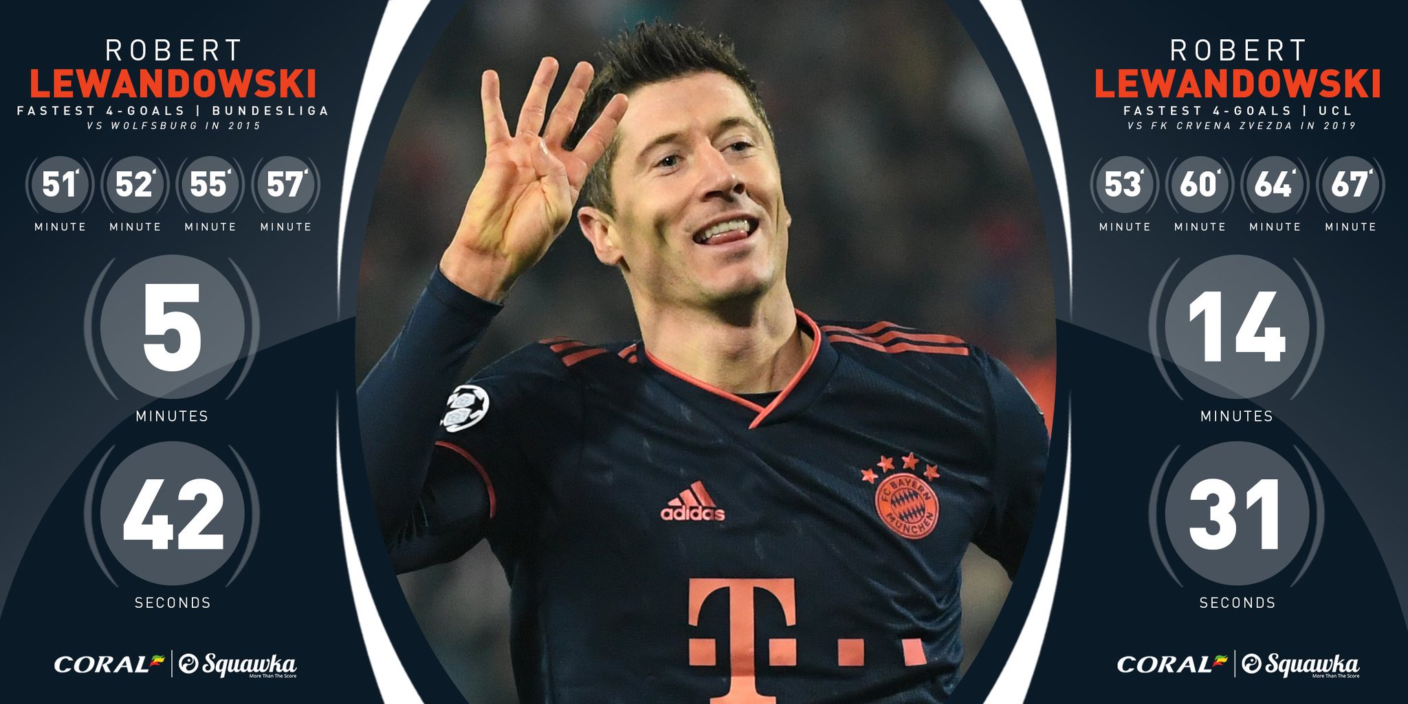 챔피언스리그에서 서로 다른 두 팀을 상대로 4골을 기록한 선수는 메시 한 명이었는데 이제 레반도프스키가 추가되었습니다.