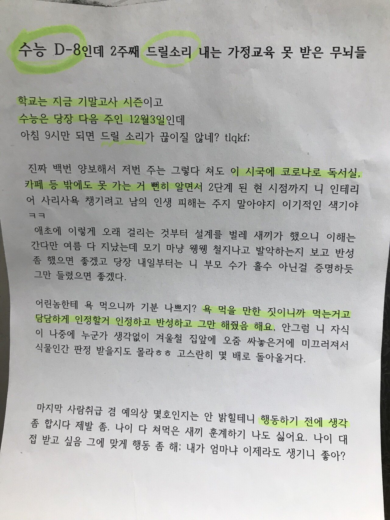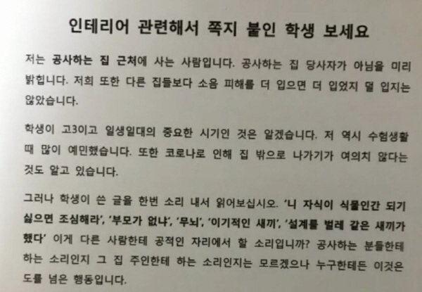 저희 아파트도 인테리어 공사 많이 하는 편인데 주말 아침부터 혹은 평일 오전 9시도 되기 전에 공사 소음 나면 짜증이 나긴 하는데 저런 패드립은 도를 넘어도 한참 넘었죠. 0