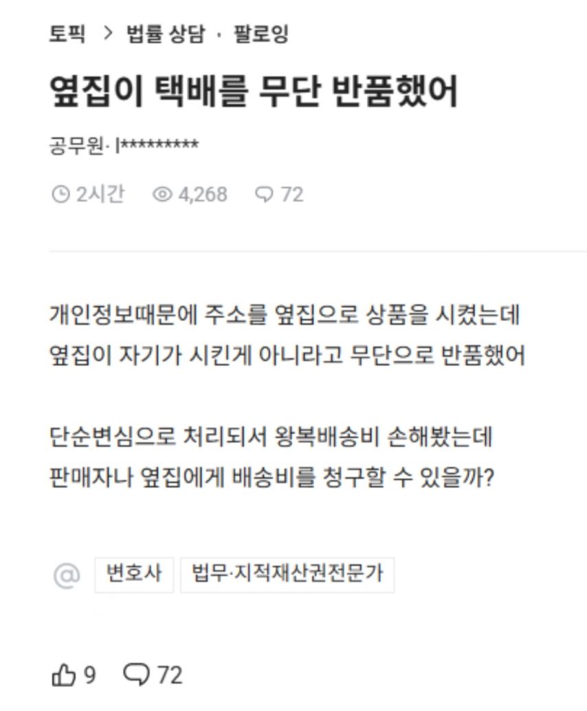| Subject | 옆집이 내 택배를 무단반품 시켰어 |