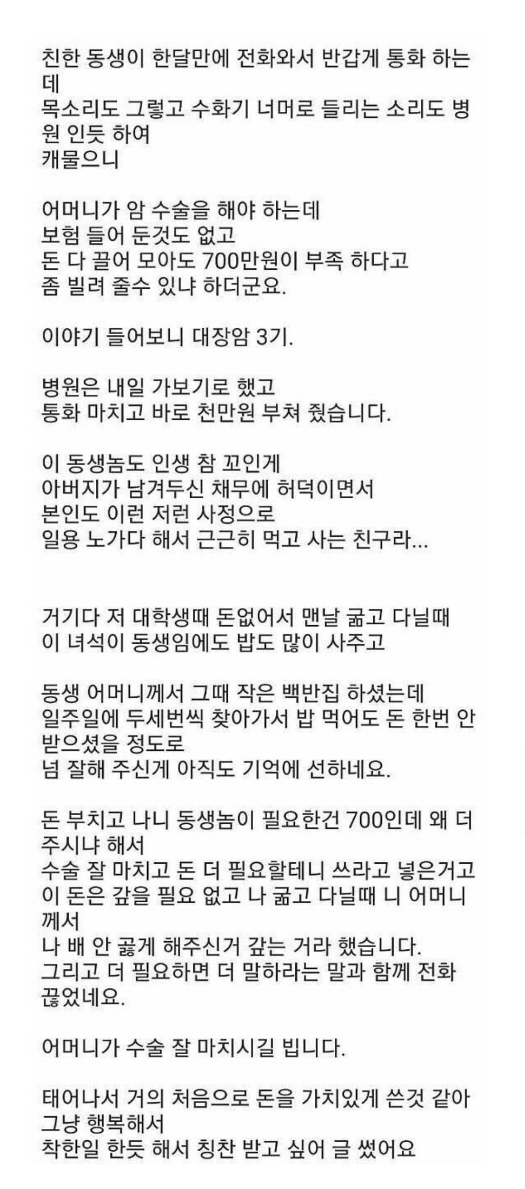 오늘 아는 동생에게 1000만원 줬습니다