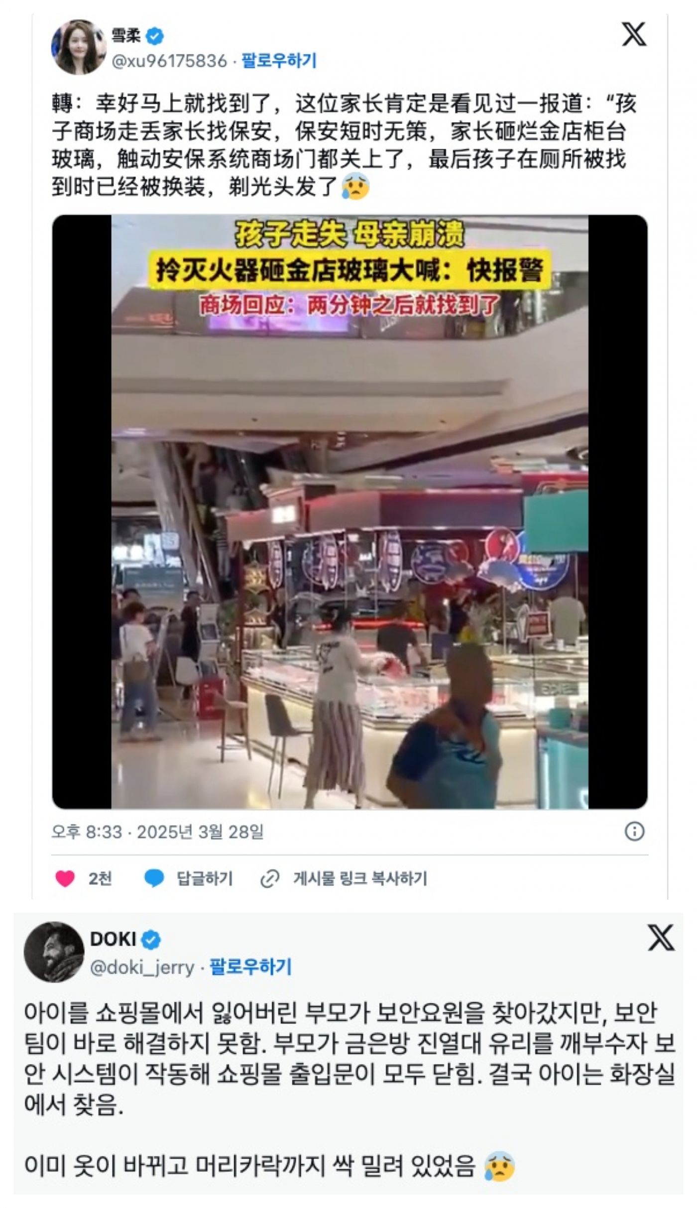| Subject | 백화점에서 아이 잃어버리고 귀금속 진열대 깨부순 중국 엄마 |