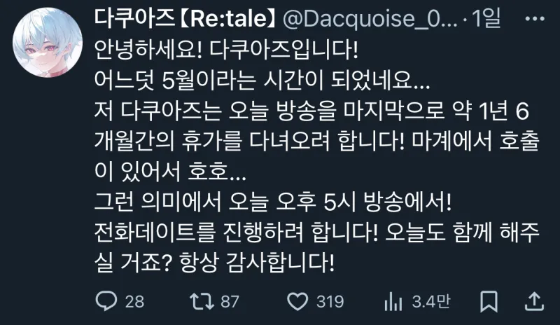 Subject   어느 한국 남성 버튜버의 휴방사유