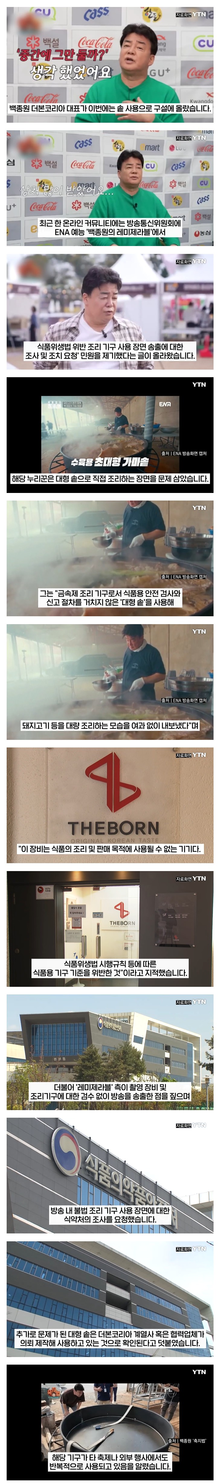 저 조리기구 자체가 문제가 있어서 식약처가 조사를 해야하나? -> 순수 무쇠재질 조리기구는 아주 흔함 그리고 어쨌든 문제가 있는지 없는지는 식약처가 조사해봐야 결과로서 알 수 있다. 뭐 만에 하나 중금속이 들어있다던가 그럴 수도 있는거긴 하니까요... 근데 그게 백종원 잘못이 되나? 그건 또 다른 얘기죠... 업체에서 제조해서 납품받은거면 제조업체 책임인거지... 저런 류의 솥이면 전문업체 제작일텐데 그럼 더더욱 그렇죠.