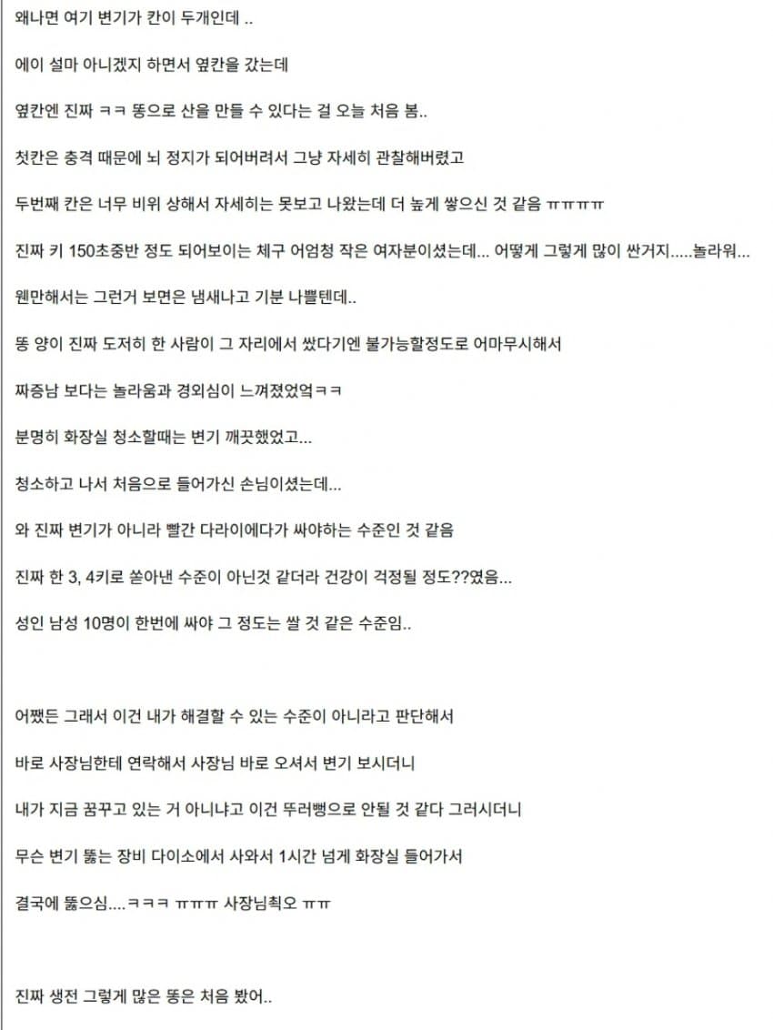 | Subject | [혐주의] 산처럼 싸고 간 여자손님 썰 |