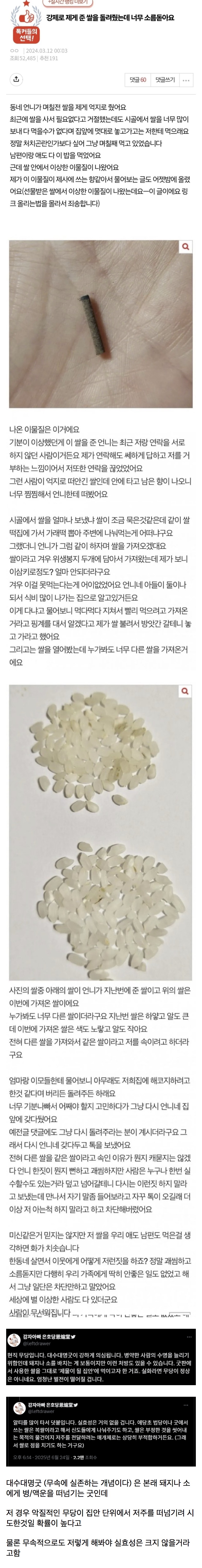 68958 [pann] 강제로 제게 준 쌀을 돌려줬는데 너무 소름돋아요 2 swear 25/06/25 2982 0