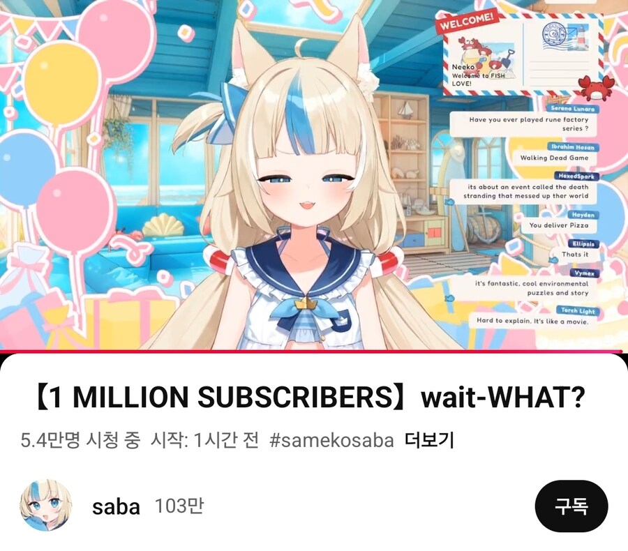 Subject   백만 구독자 신기록 쉰인 외국 버튜버
