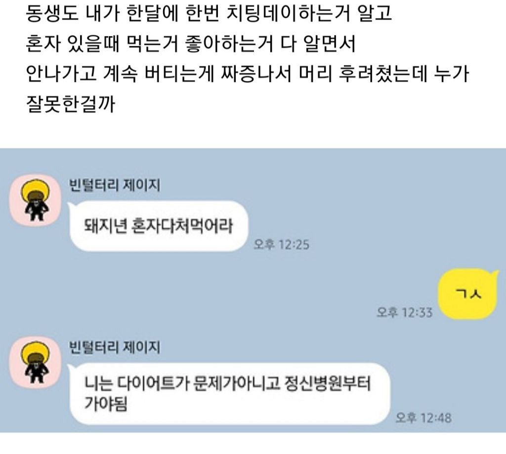 | Subject | 4~5인분이나 해놓고 한 입도 못준다는 언니 잘못이다 vs 치팅데이 알면서 달라고 한 동생 잘못이다 |
