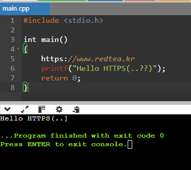 #include <stdio.h> int main() { https://www.redtea.kr printf("Hello HTTPS(..??)"); return 0; } 이 코드, 실제로 실행되는 코드입니다? 0