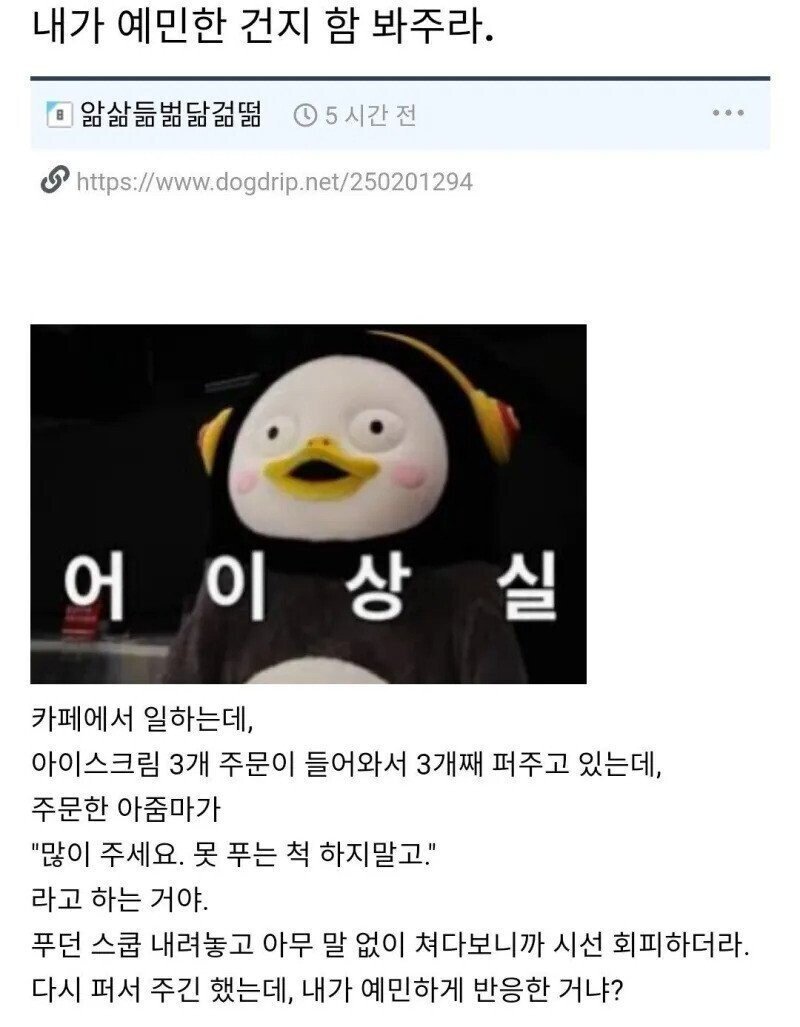 자영업 초기나 알바한지 얼마 안됐으면 빡치죠 ㅋㅋㅋ 지금의 저라면 능글늘글 웃으면서 이미 많이 퍼드렸는데요하면서 웃겠지만 ㅋㅋ 2