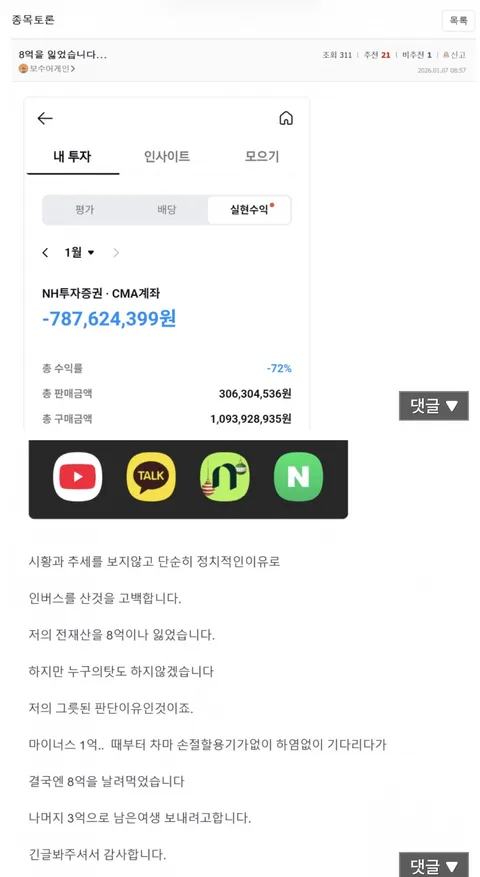 70477 8억을 잃었습니다. 4 활활태워라 26/01/11 1551 0