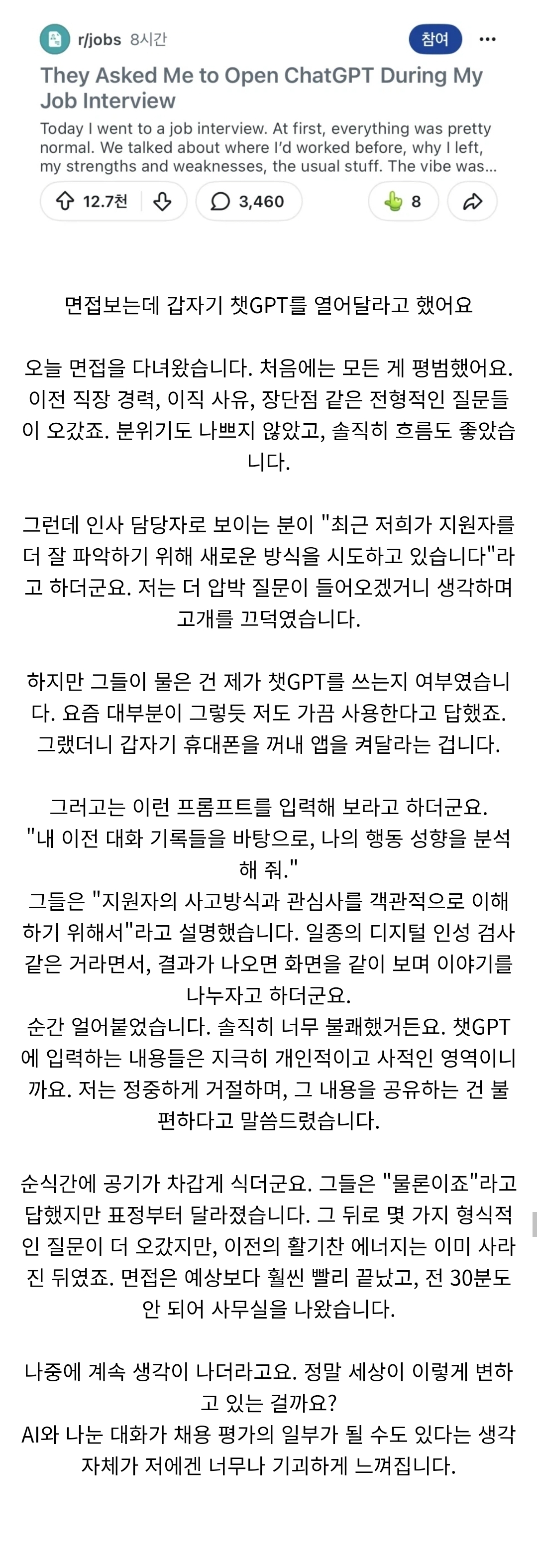 | Subject | 면접장에서 챗gpt 열어달라고 질문받았습니다(레딧에서 추천 만이천개 받음) |