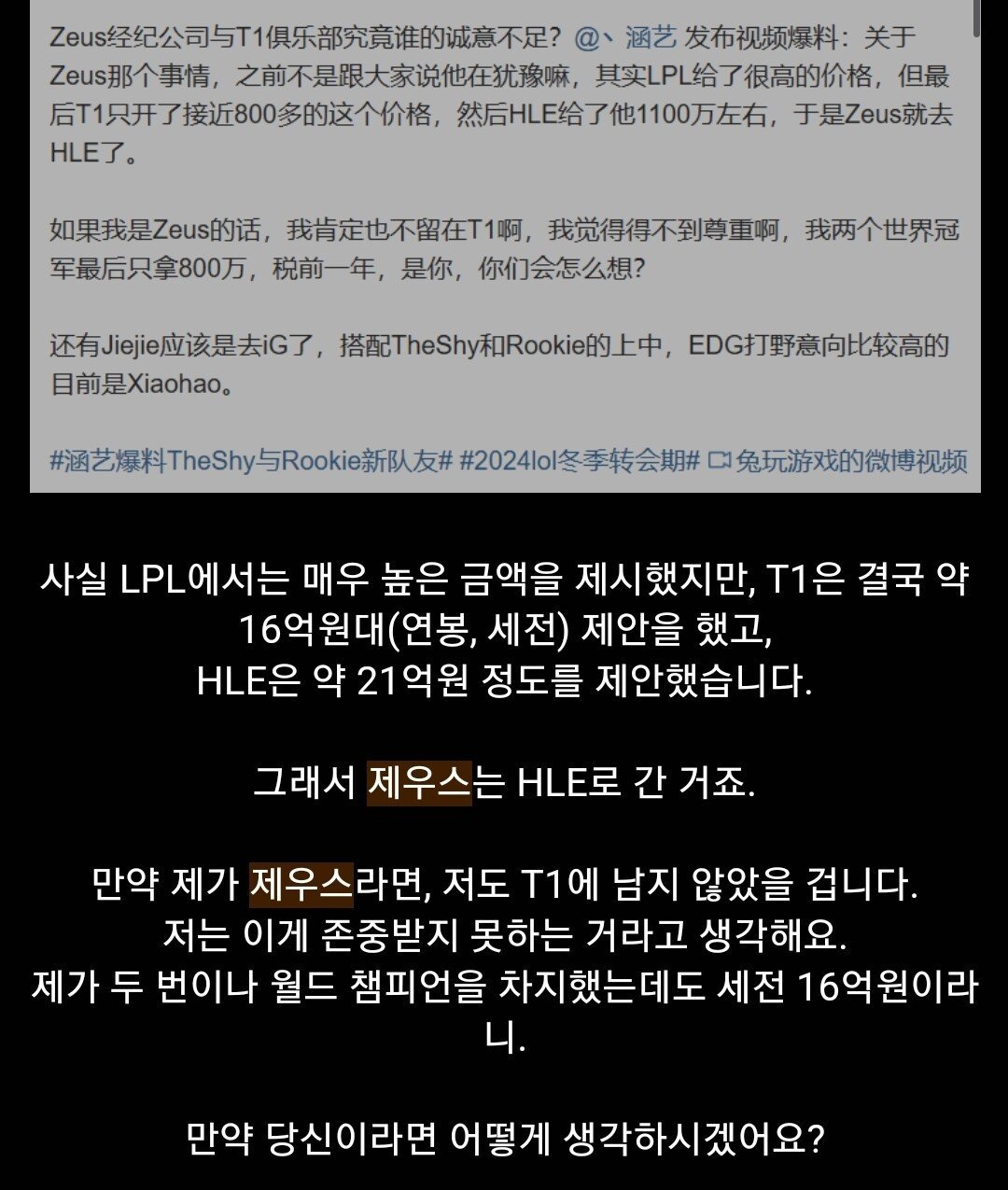 티원 측에서 아무말이 없자 한이는 아예 연봉까지 공개해버렸군요. 5억이면 꽤 큰 차이인데 이러면 당연히 누구라도 이적을 결심할 수밖에 없죠. 그냥 처음부터 솔직하게 돈이 없어서 못잡았다고 하지 참 짜칩니다. 아니면 오페구케 다 재계약했는데 니가 감히 재계약을 안해? 라고 진짜 괘씸하다고 판단한건가? 어찌 보면 그게 더 합리적일수 있겠네요. 2