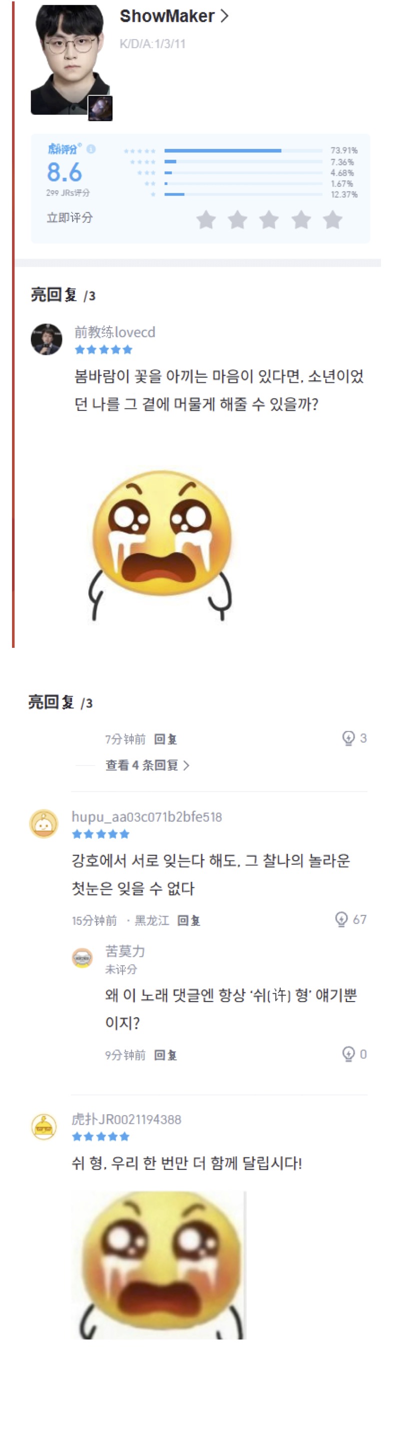 따거 형님들 반응이 참 찰지고 낭만적인 것도 있는데 스타판 시절엔 저런류 글이 우리나라 이스포츠판에도 꽤 많았는데 어느 순간부터 오글거린다면서 대부분 없어져서 참 아쉽습니다.. 3