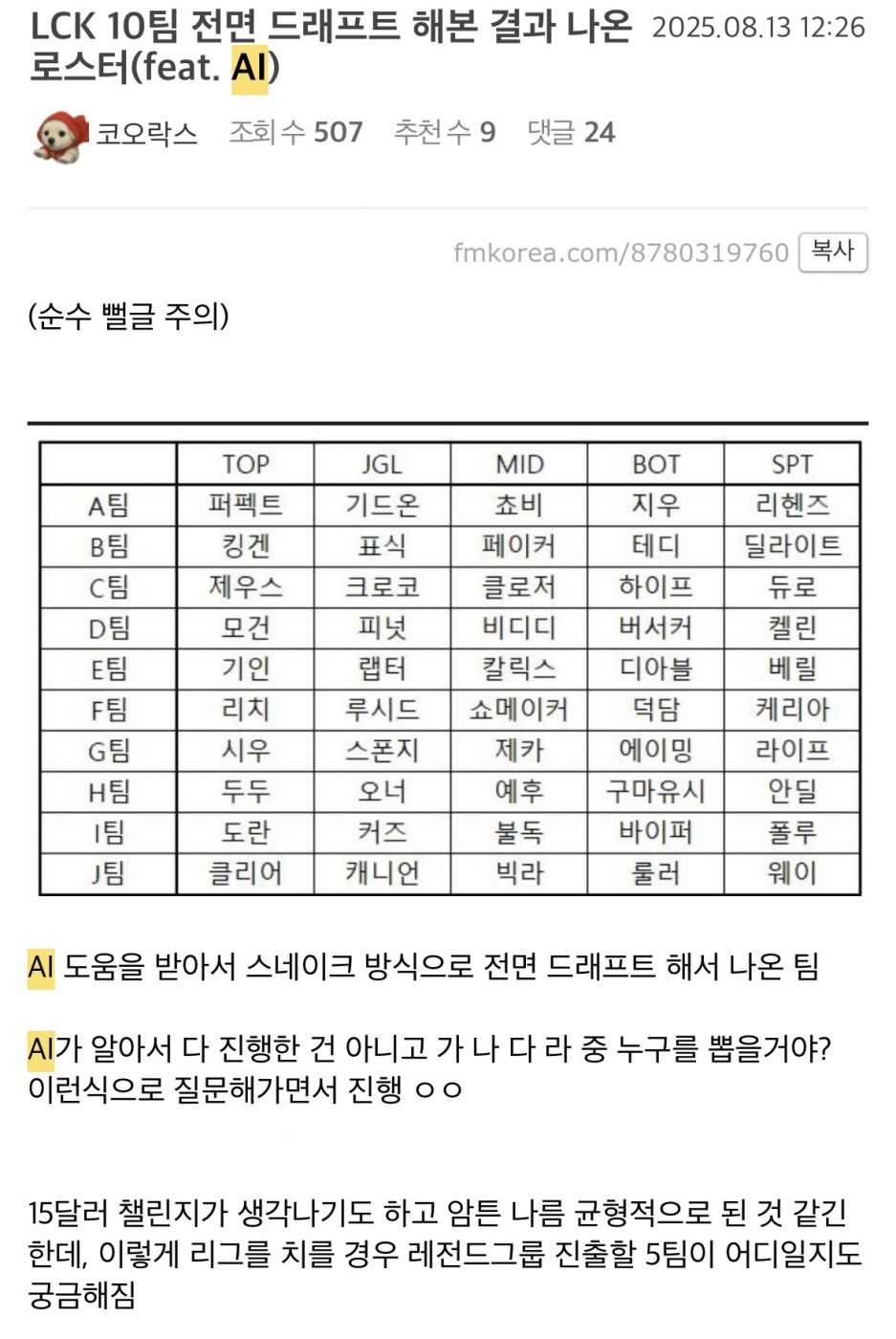 | Subject | 이거 상당히 황밸느낌인데 우승 가능성은 B팀이 제일 높아보입니다. 그 다 |