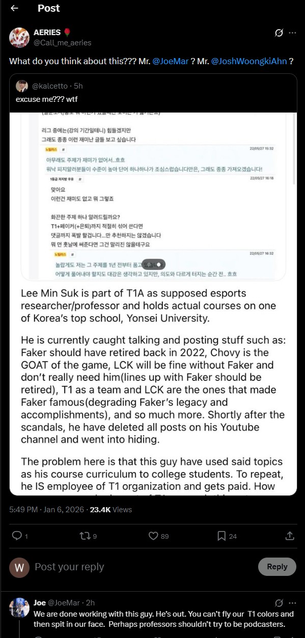 아침에 이야기했던 T1 관계자의 부적절한 행적을 누가 X(트위터)에 찔렀는데, 그러고 나서 조 마쉬가 리트윗으로 해당 인원을 해고했다고 X(트위터)를 통해 이야기했다고 합니다. 뭐 개인활동 하는 거 다 좋은데 재직하는 회사에 대한 신의는 지켜야 하는 게 사람의 예의 아닐까요? 물론 조 마쉬도 딱히 좋은 사람은 아니고, 도화지 운운했던 그 작자도 잘려도 진작에 잘랐어야지 도화지 사건 이후로 훨씬 더 있다 계약종료되고 그랬는데, 내부총질 하고 신의성실의 의무 내다버린 사람들은 가만 놔두지 말아야 할 일이지요.