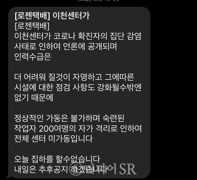 | Subject | 로젠택배 이천물류센터서 21명 집단감염…택배 지연 불가피 |