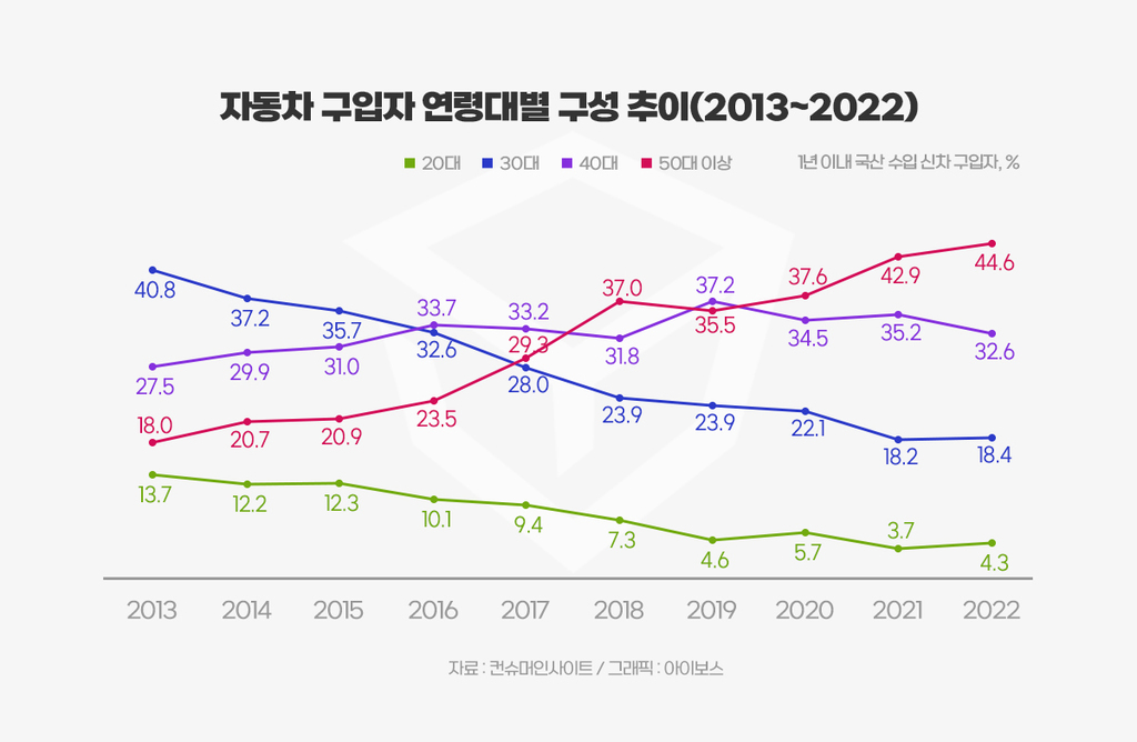 https://www.news1.kr/industry/auto-industry/5656734 통상 준중형 세단을 많이 찾는 사회초년생들이 신차 구매를 줄인 것도 영향을 미쳤다. 한국자동차모빌리티산업협회(KAMA)에 따르면 지난해 1~11월 20대와 30대의 승용 신차 등록 비율은 전체의 5.4%, 14.2%로 관련 집계가 시작된 2009년 이래 가장 낮은 수준을 보였다... "취업난과 경기 불황으로 20~30대 신차 구매가 줄어드는 가운데 구매 여력이 있는 사회초년생들은 중형 세단이나 SUV로 넘어가는 추세" 수도권 1인 청년 가구의 증가 = 자가용이 필요 없어지는 시대 자가용을 산다면 그건 필요해서가 아니라 하차감을 위해서일 것 1