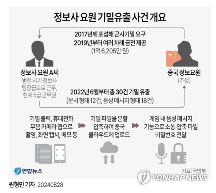 https://n.news.naver.com/mnews/article/001/0015171272?sid=100 A씨는 1990년대부터 부사관으로 정보사에 근무하다가 2000년대 중반 군무원으로 신분이 전환됐다. 범행 시기에는 정보사 팀장급으로 근무했으며 기소 당시 5급 군무원으로 알려졌다. 군검찰에 따르면 A씨는 2017년 4월 자신이 구축한 현지 공작망 접촉을 위해 중국 옌지 지역으로 갔다가 공항에서 중국 측에 체포돼 조사받던 중 포섭 제의를 받았다. A씨는 자신을 체포한 인원이 중국 정보요원이라고 밝혔다고 진술했다. 해당 인물의 신원과 소속은 확인되지 않았다. A씨가 빼돌린 자료는 문서 형태로 12건, 음성 메시지 형태로 18건 등 총 30건으로 확인됐다. 누설된 기밀에는 신분을 숨기고 활동하는 흑색(블랙) 요원 명단도 있었다. A씨는 중국 요원에게 약 40차례에 걸쳐 돈을 요구하며 적극적으로 범행했다. A씨가 요구한 돈의 액수는 총 4억 원에 달하며, 실제로 지인 차명계좌 등을 통해 받은 돈은 1억6천205만 원으로 공소장에 기재됐다. 더욱 더 정보요원들의 활동이 위축될 거 같은 건 그냥 저같이 아무것도 모르는 시민이 하는 생각입니다. 이런 일이 비일비재하지 않았을까요? 그러다가 한 건 터진거고... 이번 일을 계기고 더 단단해졌음 좋겠습니다. 0